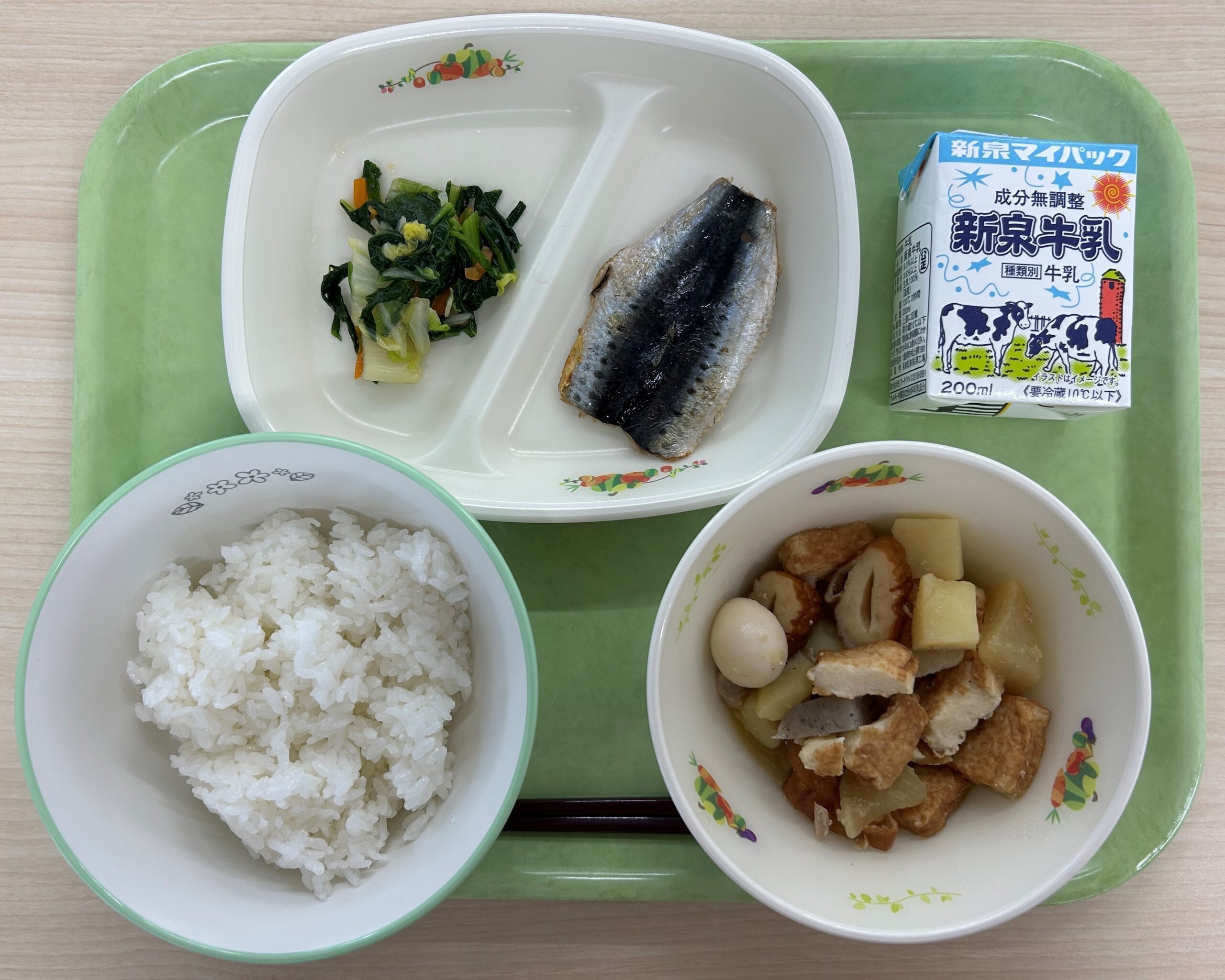 ごはん、牛乳、おでん、焼きいわし、白菜と小松菜の煮びたし