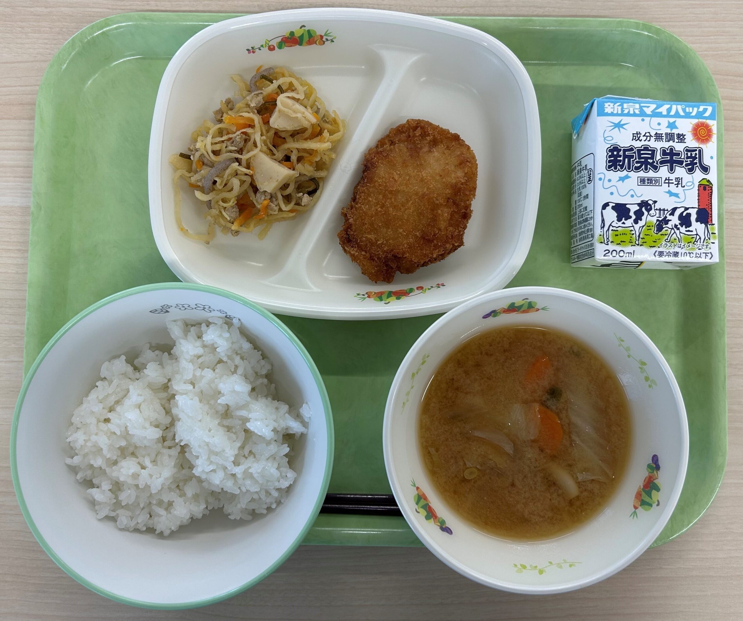 ごはん、牛乳、チキンカツ、千切りイリチー、野菜たっぷりみそ汁
