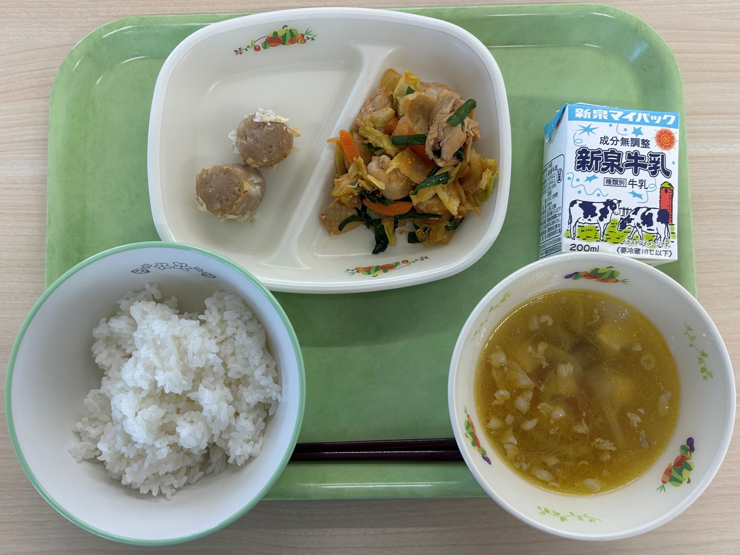 ごはん、牛乳、タッカルビ、焼きシューマイ、中華スープ