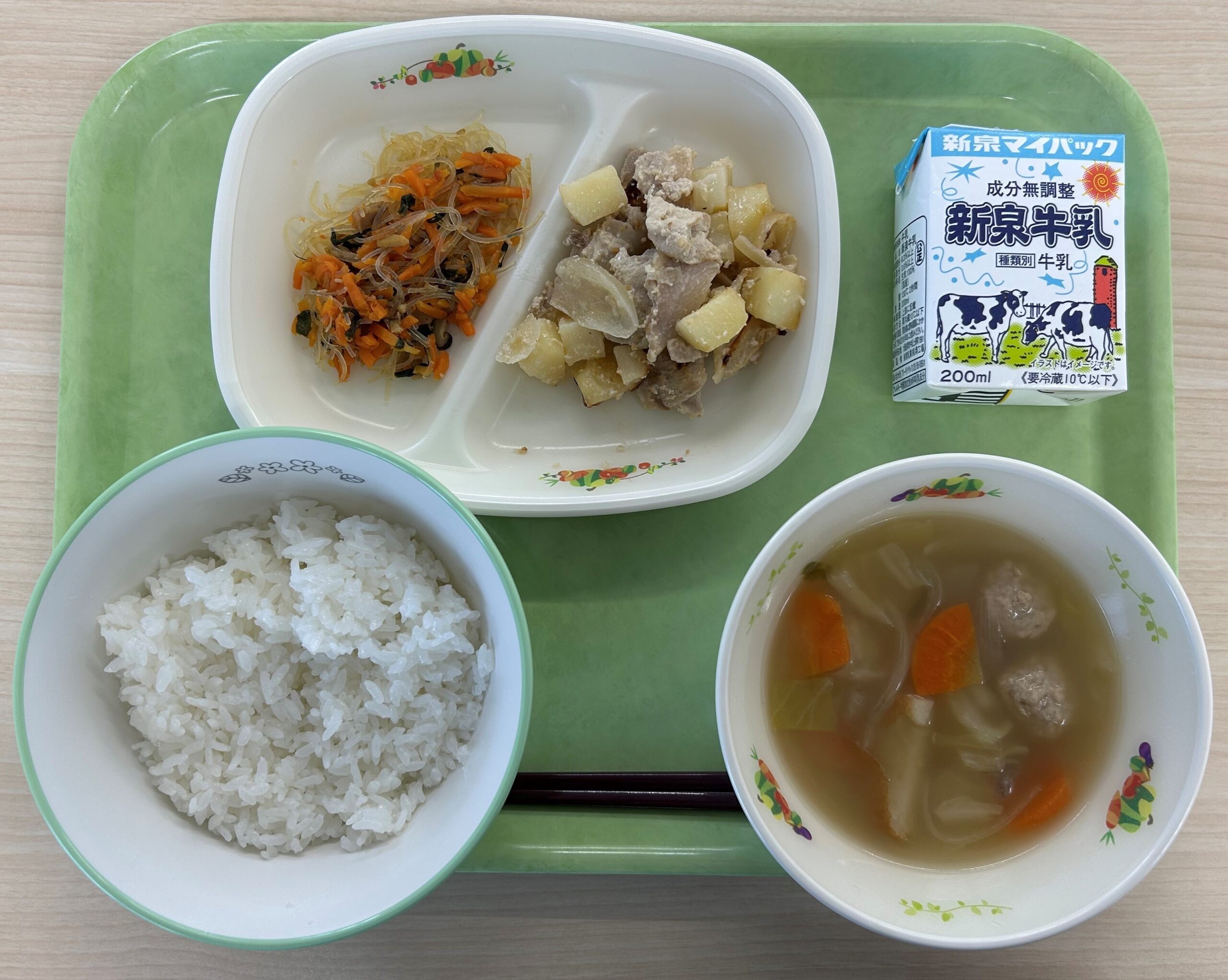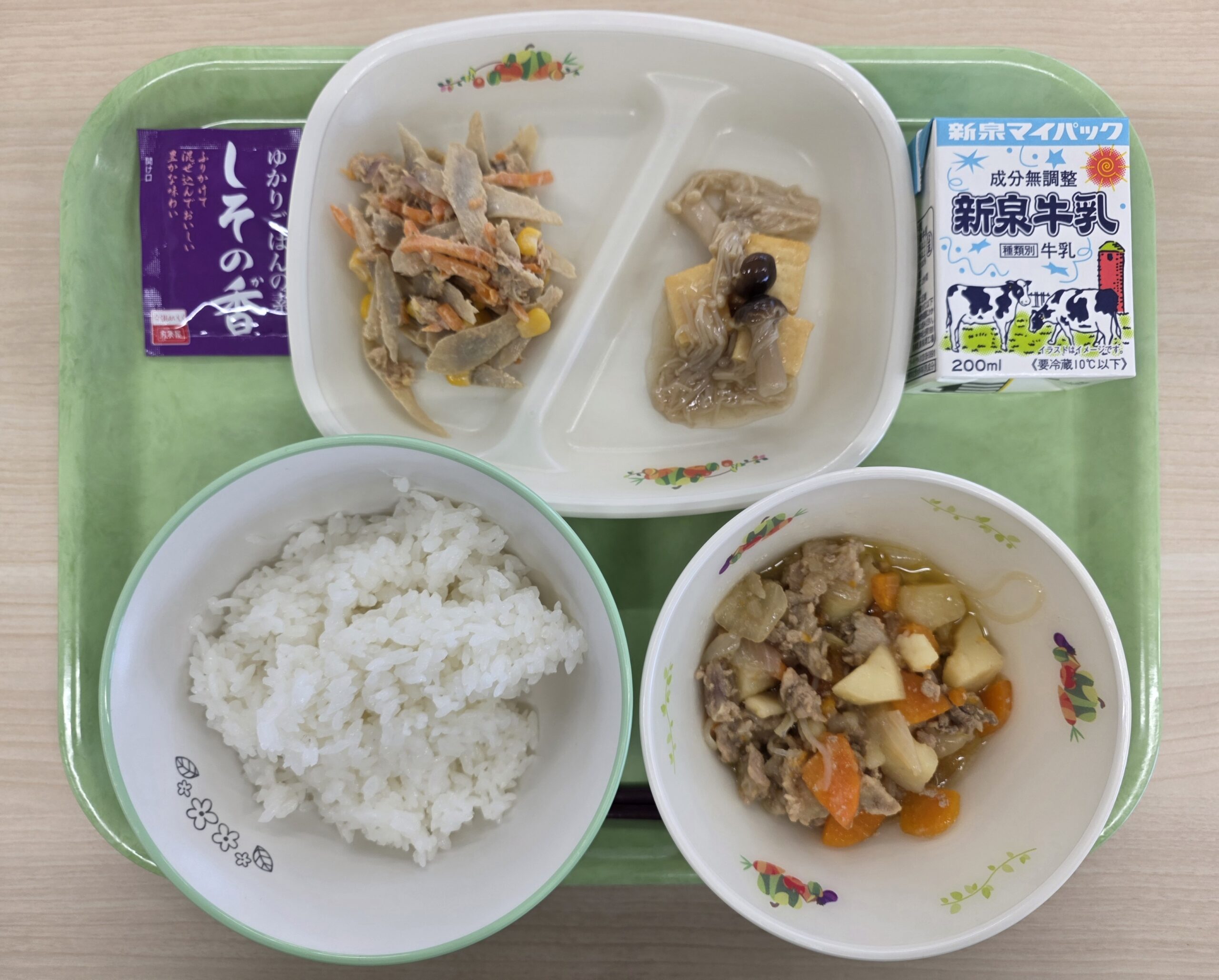 ごはん、牛乳、肉じゃが、厚揚げのしょうがあんかけ、ごぼうサラダ、ふりかけ