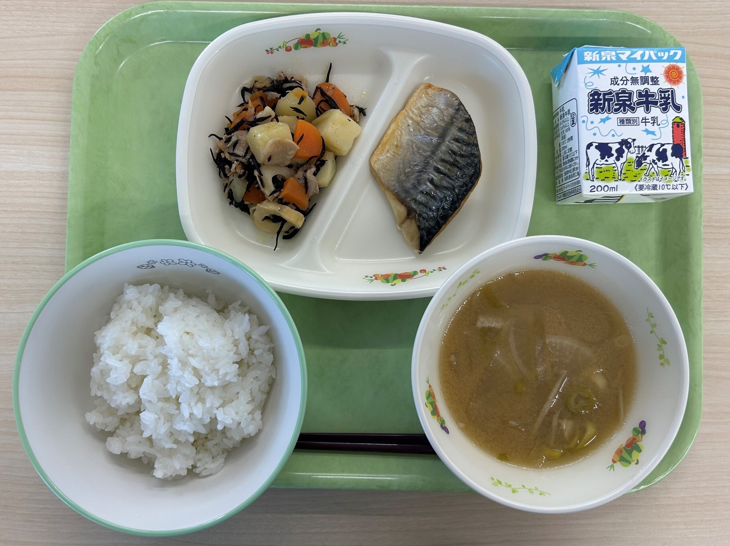 ごはん、牛乳、さばの塩焼き、じゃがいものいそ煮、五目汁