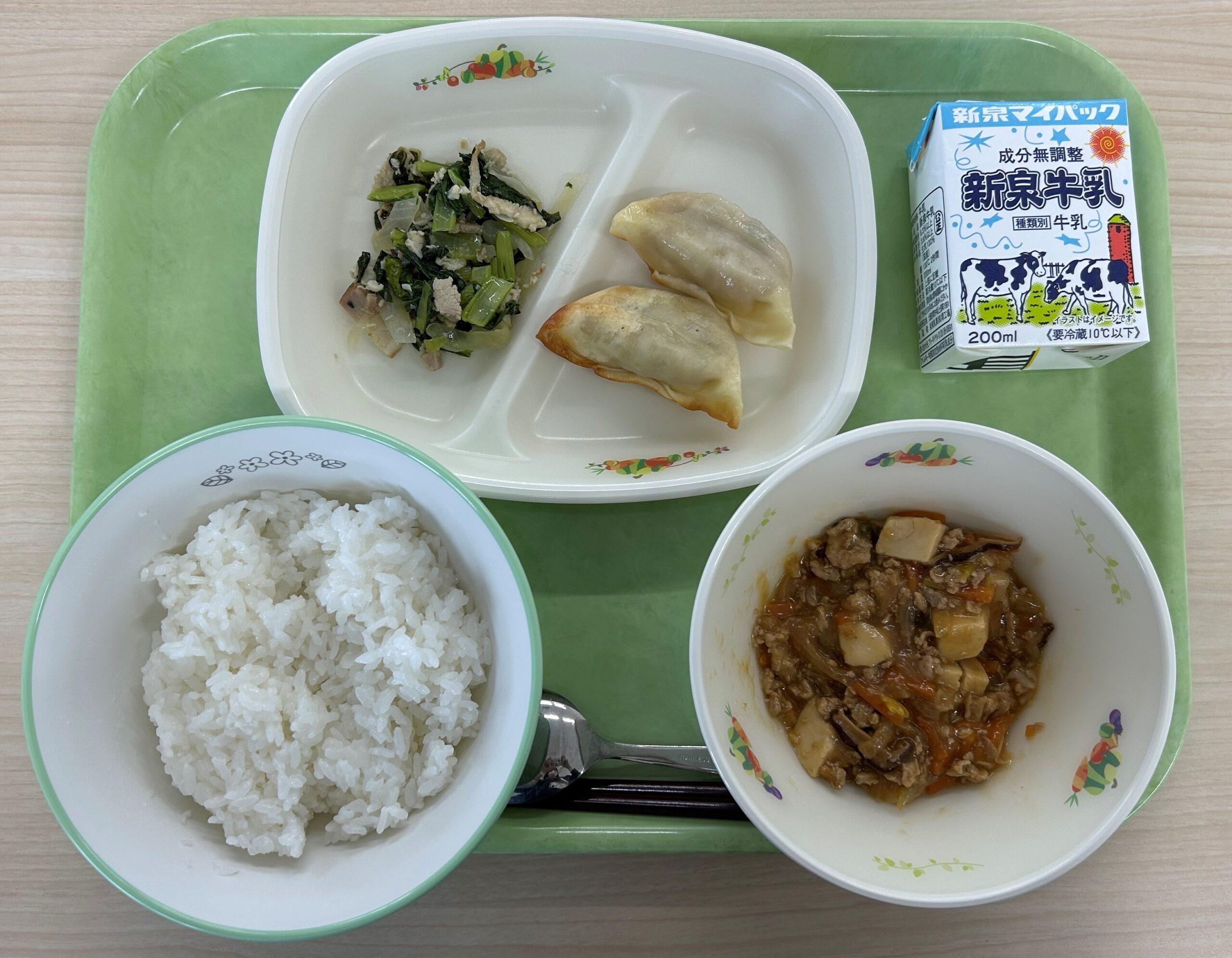 ごはん、牛乳、麻婆豆腐、焼きギョーザ、小松菜のソテー