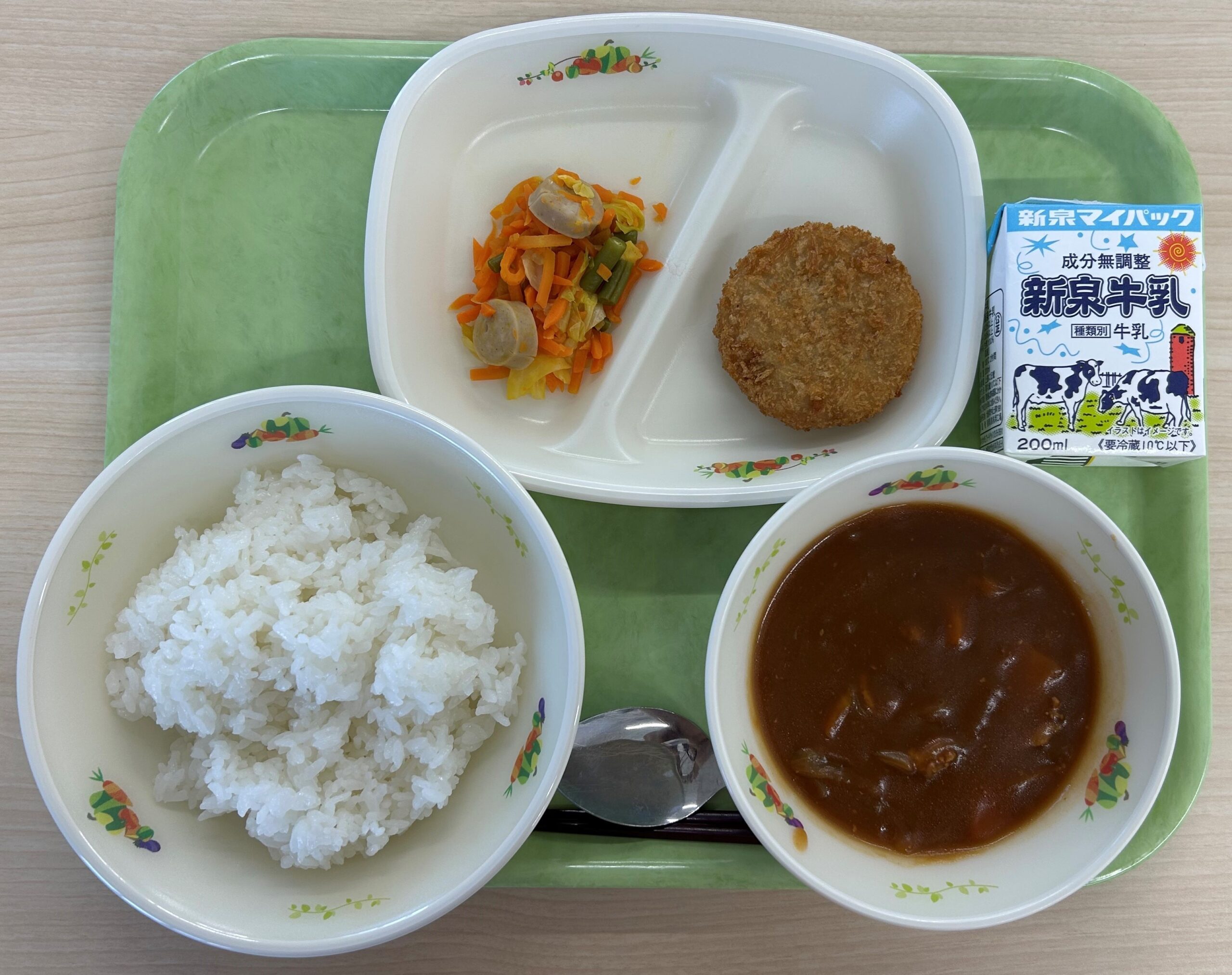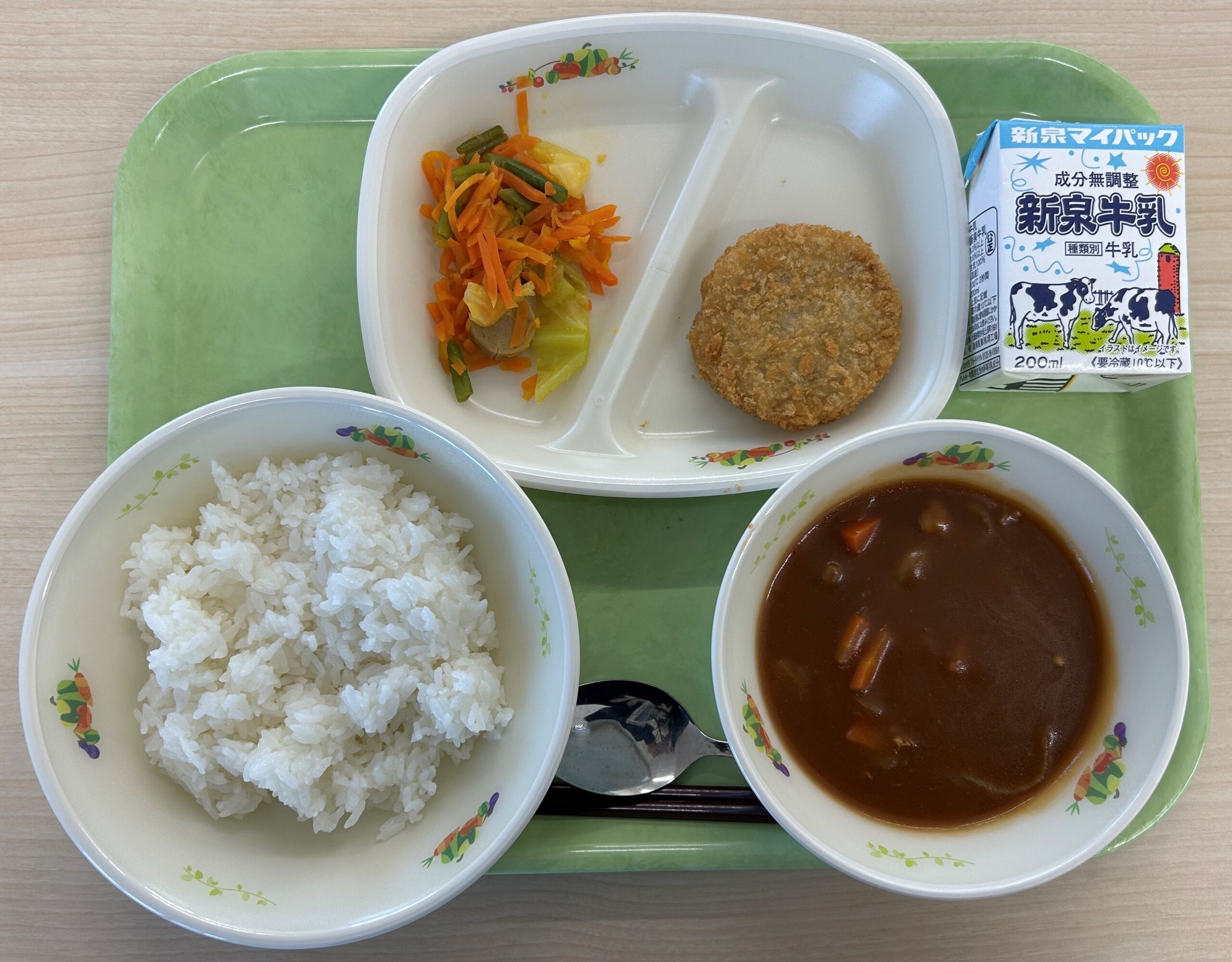 ごはん、牛乳、ハヤシライス、コロッケ、キャロットソテー
