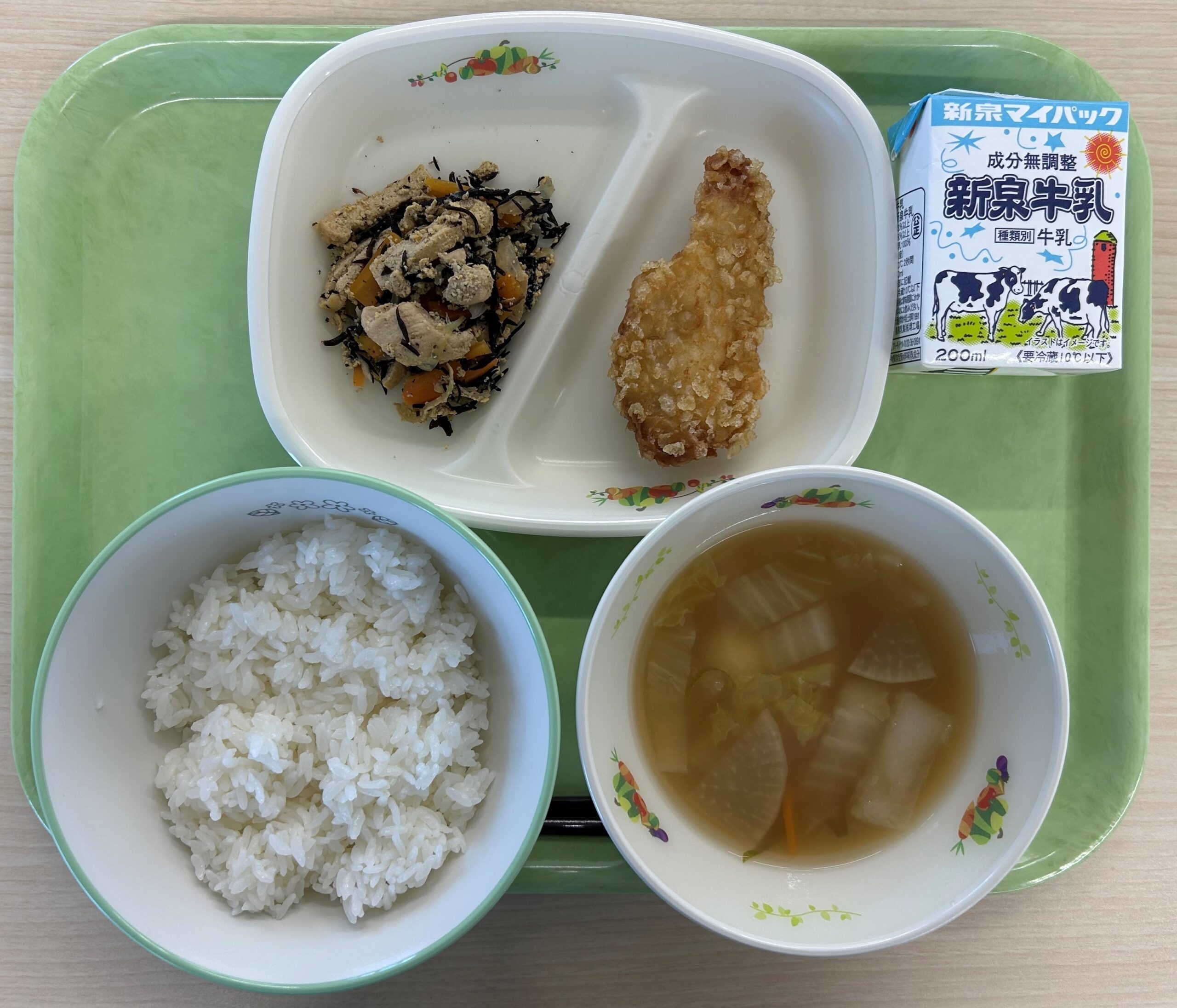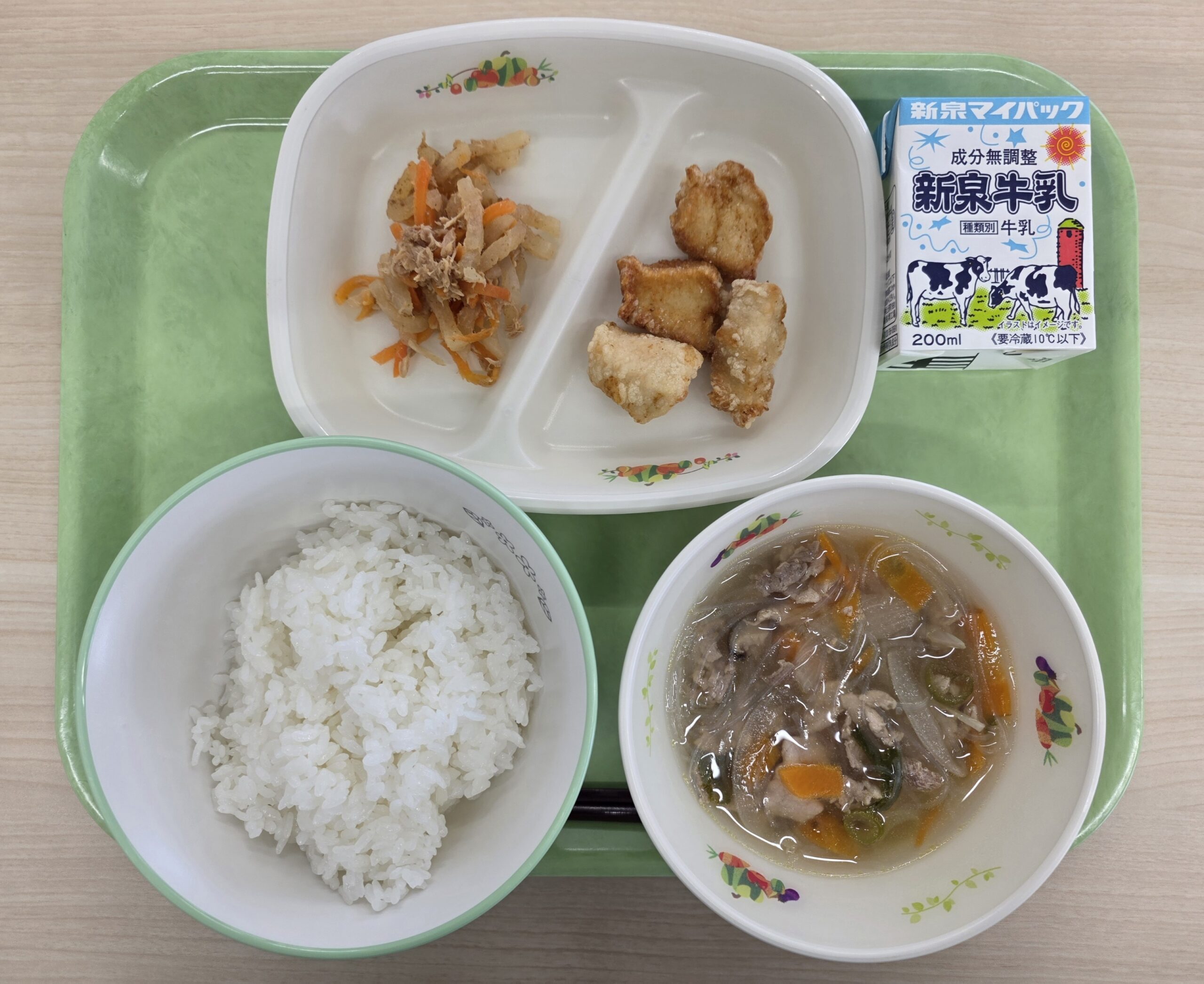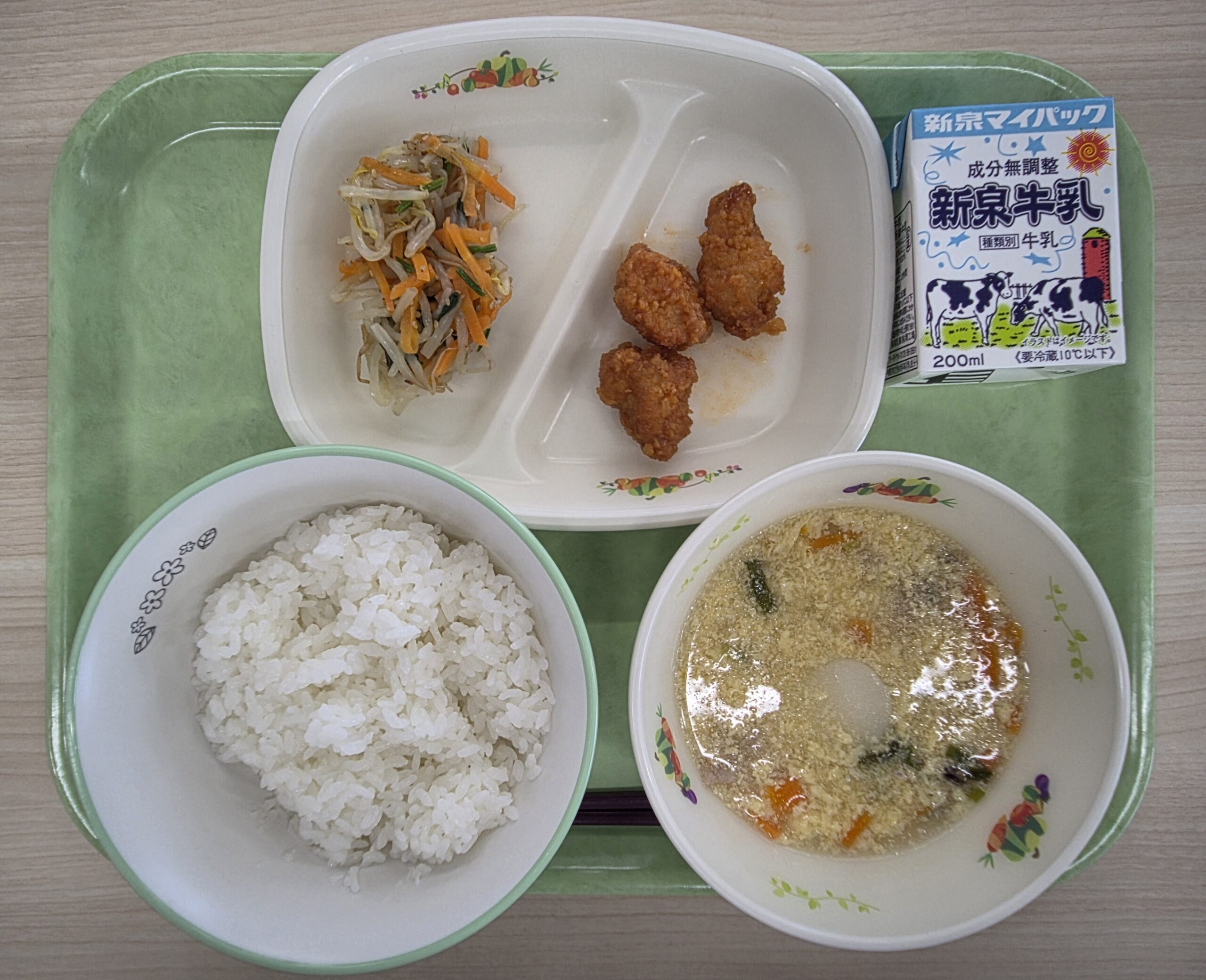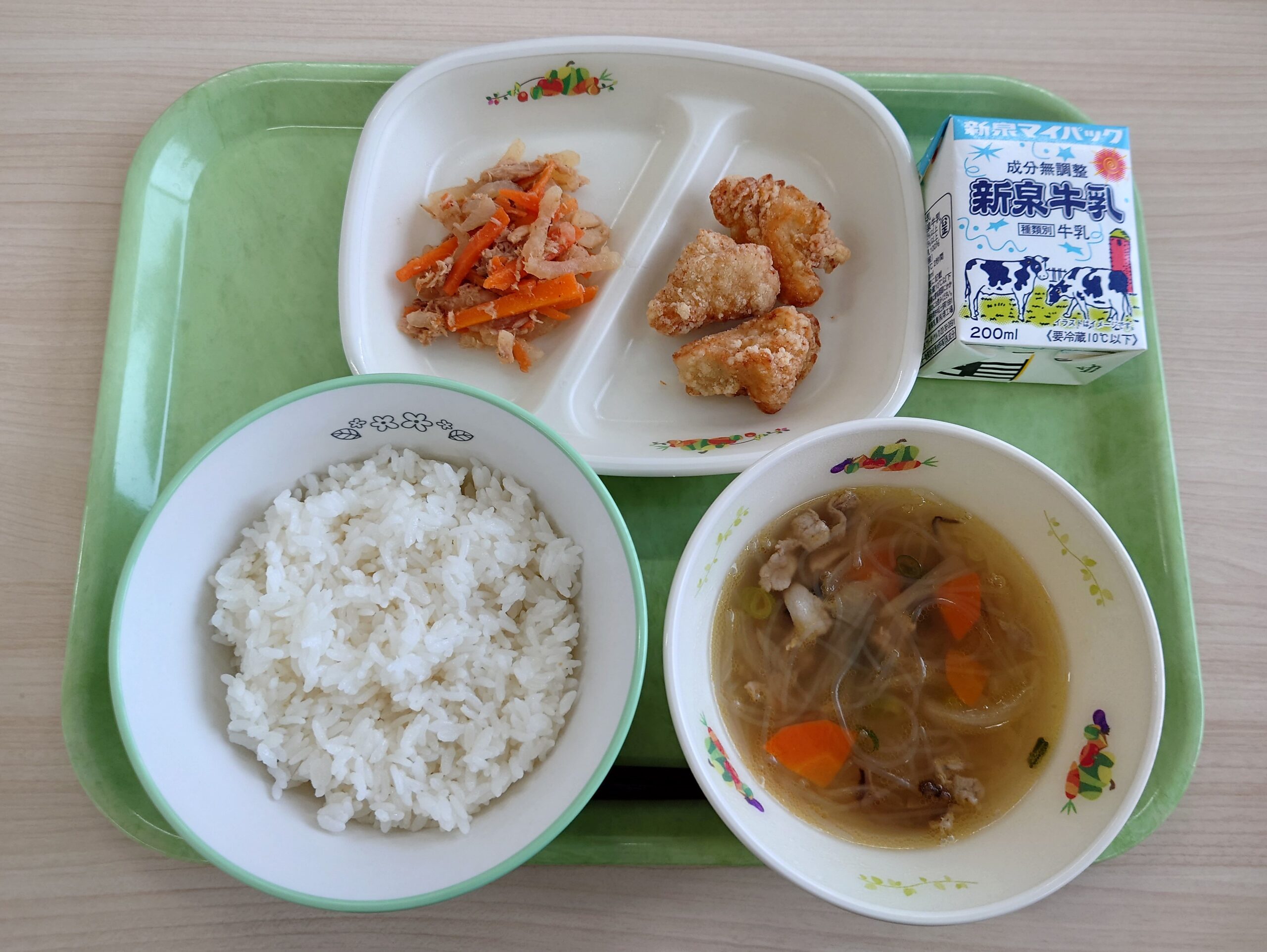 ごはん、牛乳、鶏肉のから揚げ、だいこんサラダ、春雨スープ
