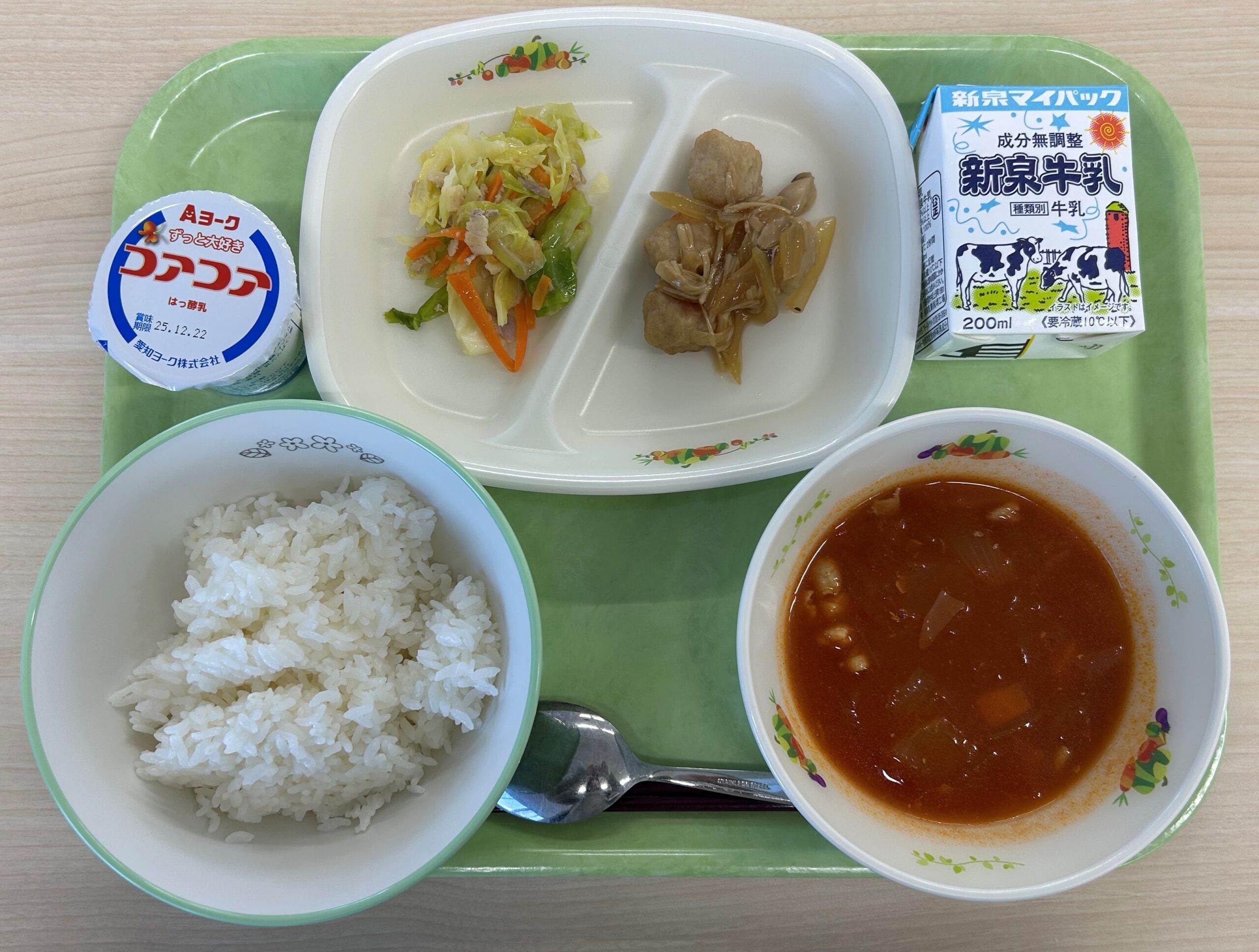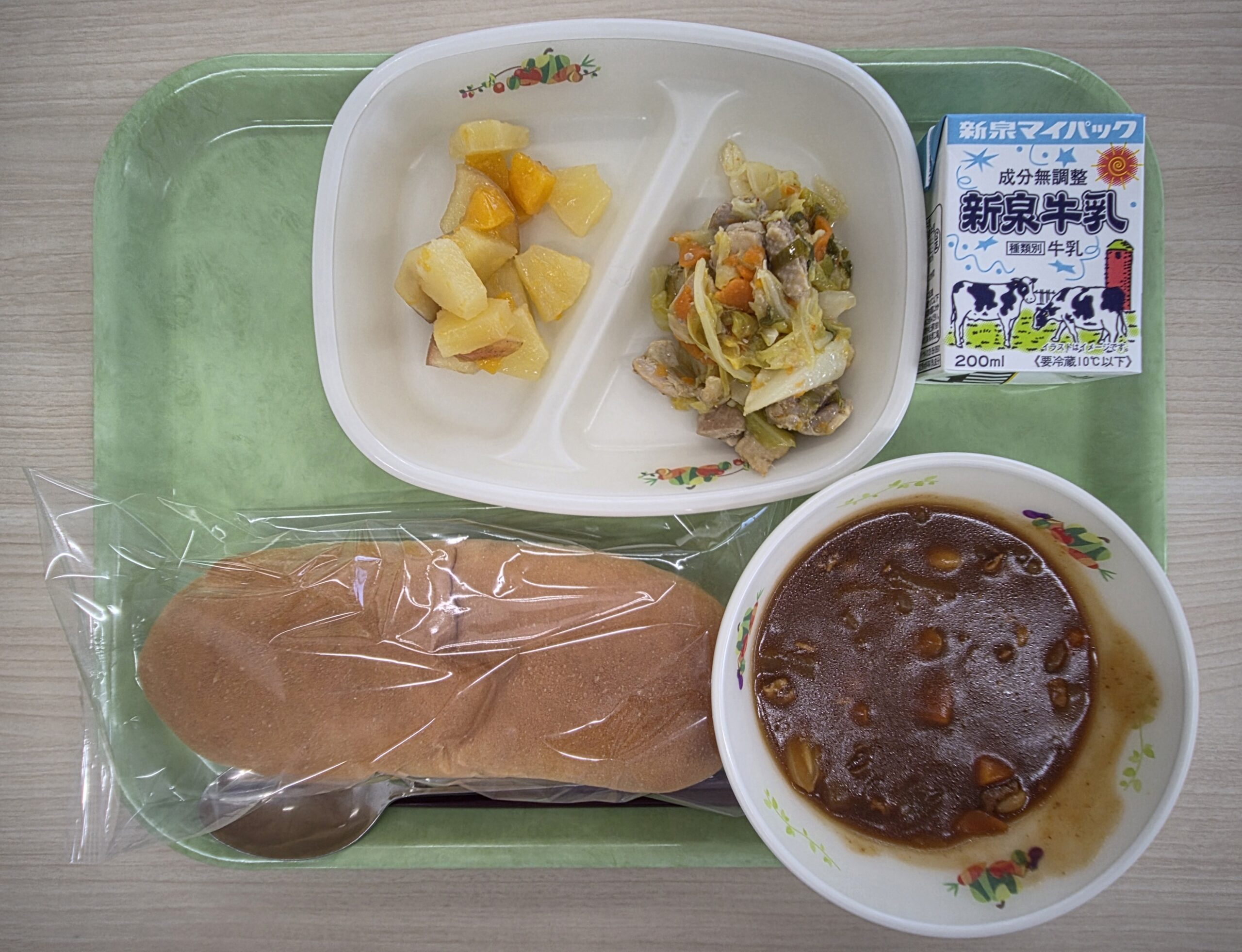 コッペパン、牛乳、ビーンズシチュー、鶏肉とキャベツのガーリックチキン炒め、フルーツコンポート