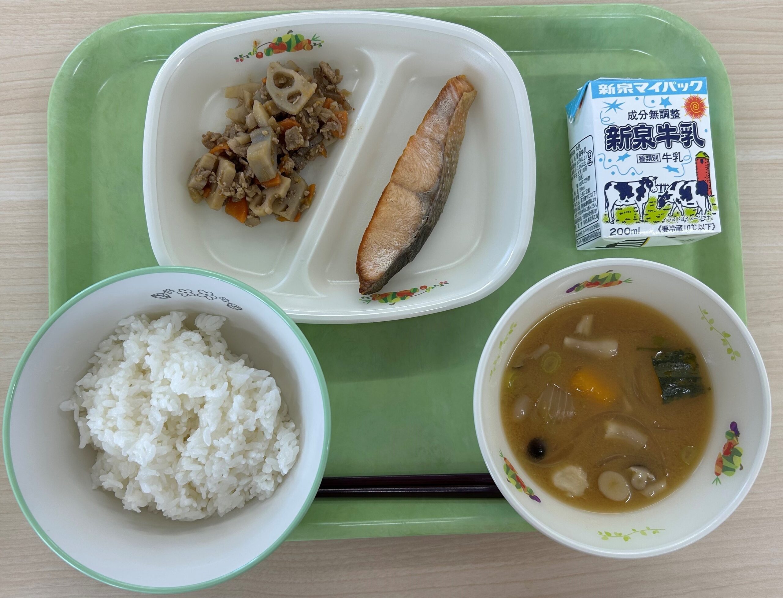 ごはん、牛乳、鮭の柚庵焼き、れんこんのきんぴら、なんきんのみそ汁