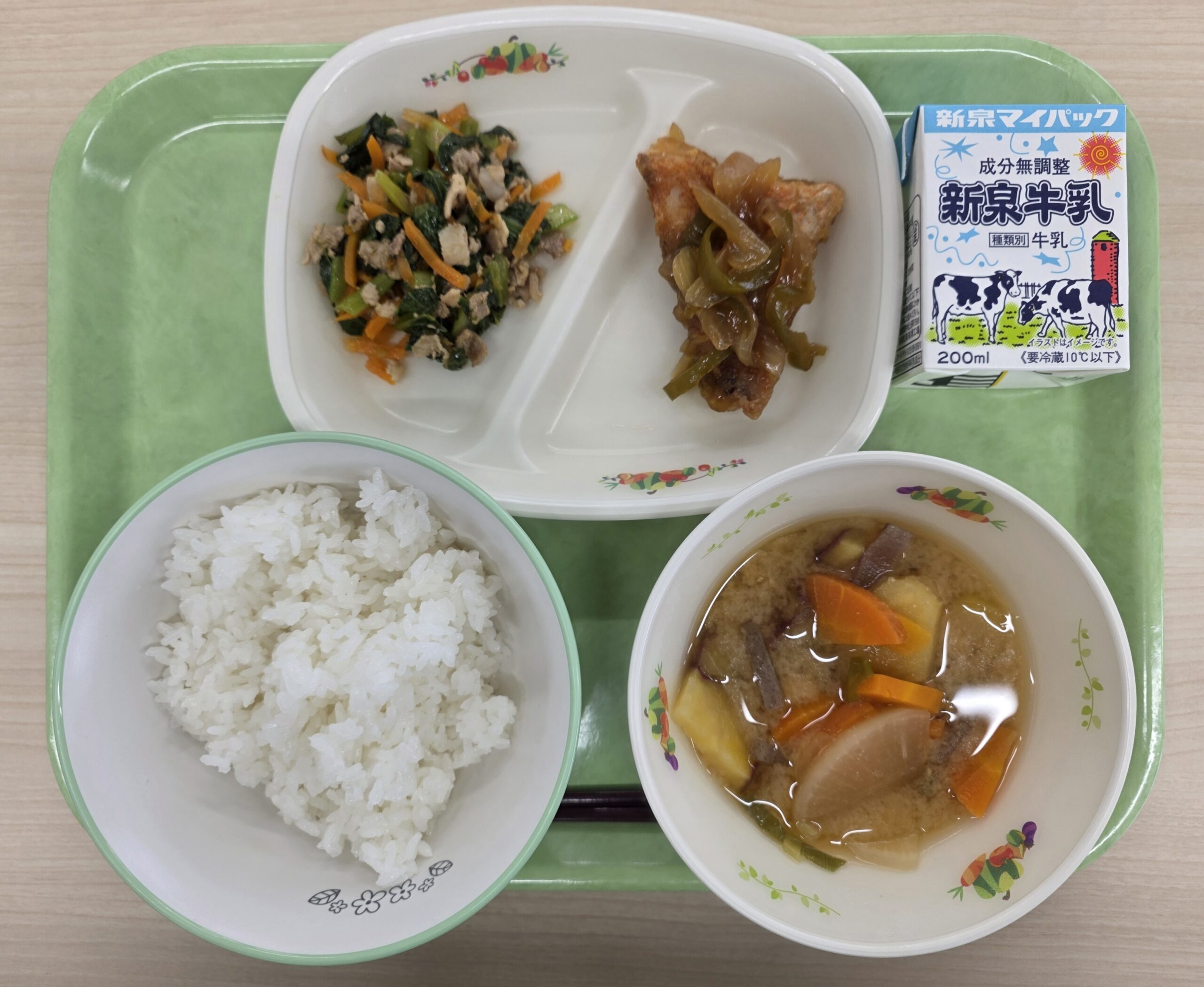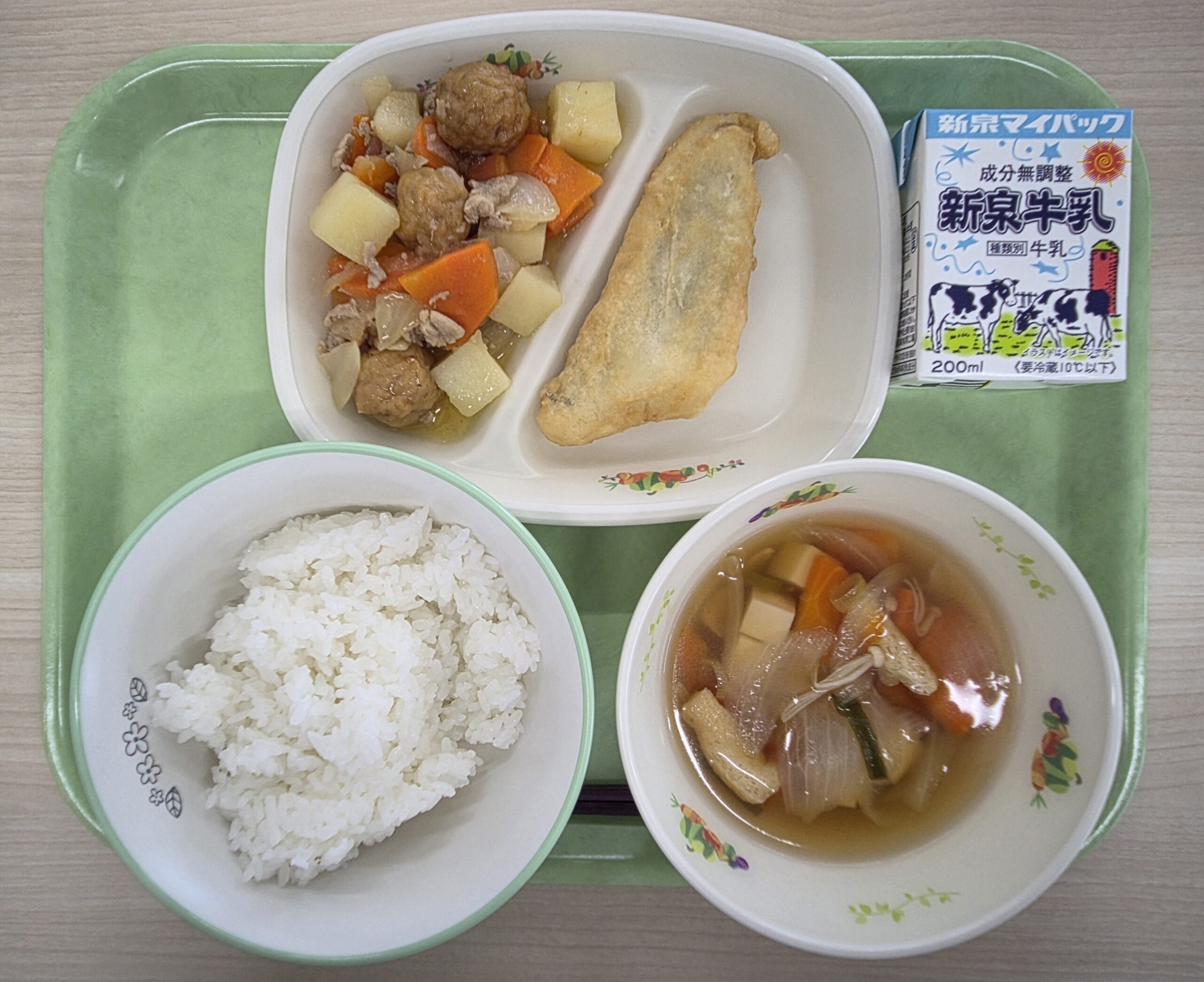 ごはん、牛乳、白身魚の天ぷら、豚肉と野菜のしょうが煮、すまし汁