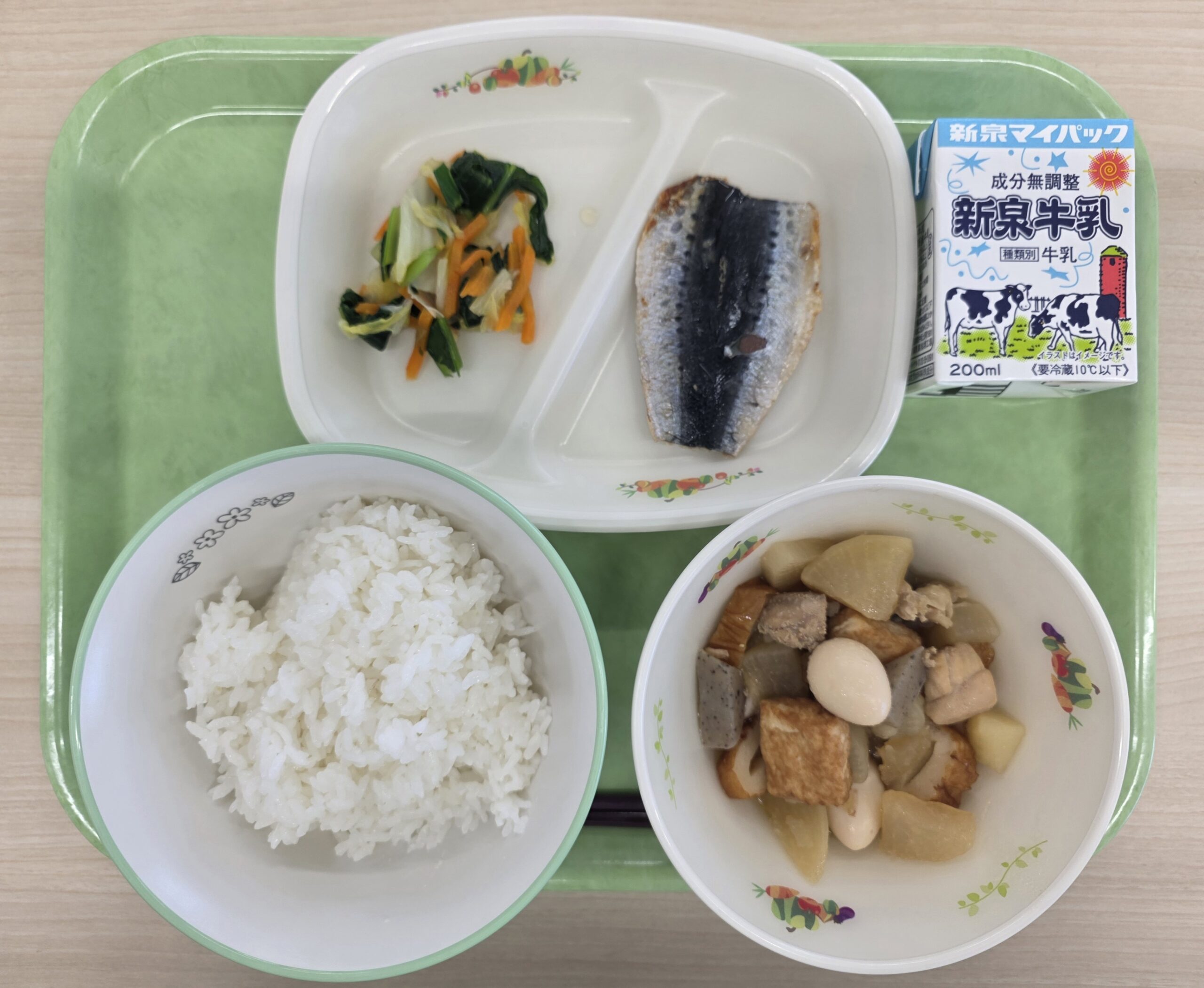 ごはん、牛乳、おでん、焼きいわし、白菜と小松菜の煮びたし