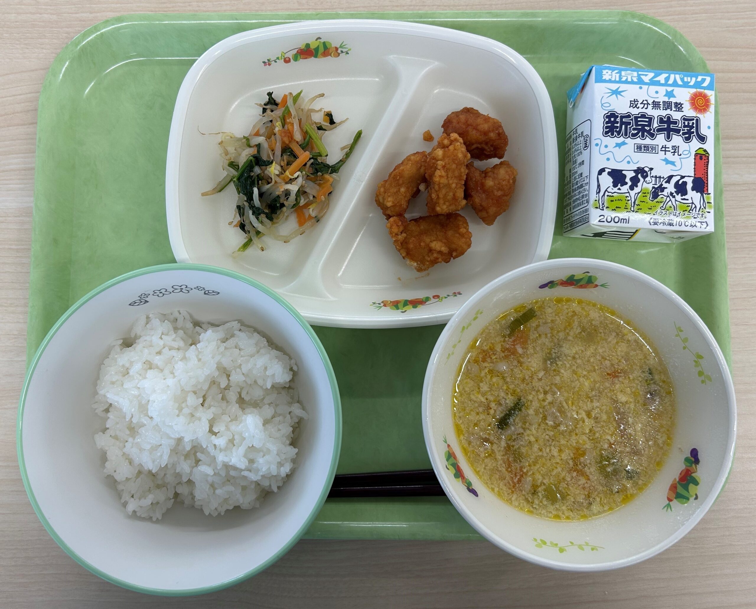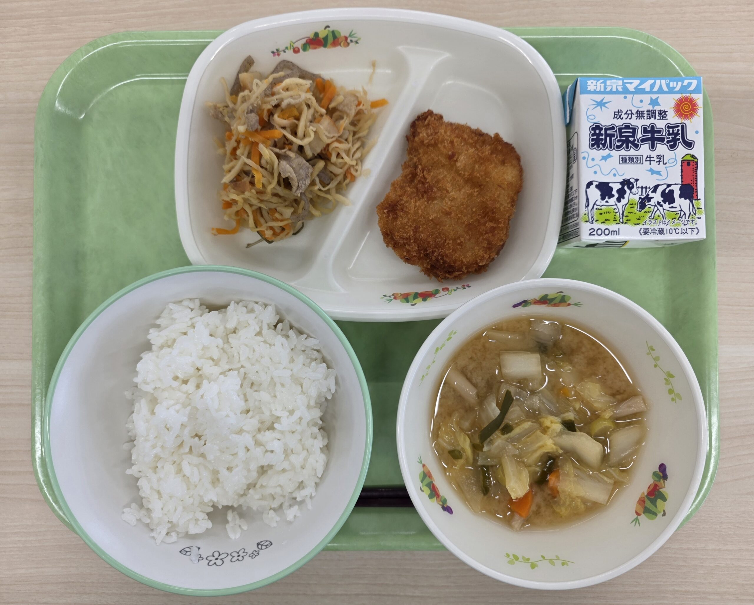ごはん、牛乳、チキンカツ、千切りイリチー、野菜たっぷりみそ汁