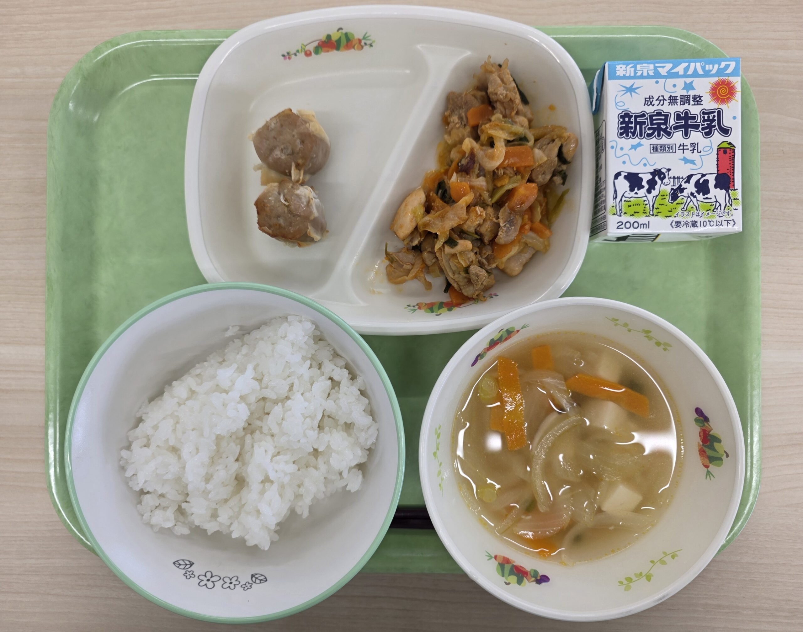 ごはん、牛乳、タッカルビ、焼きシューマイ、中華スープ