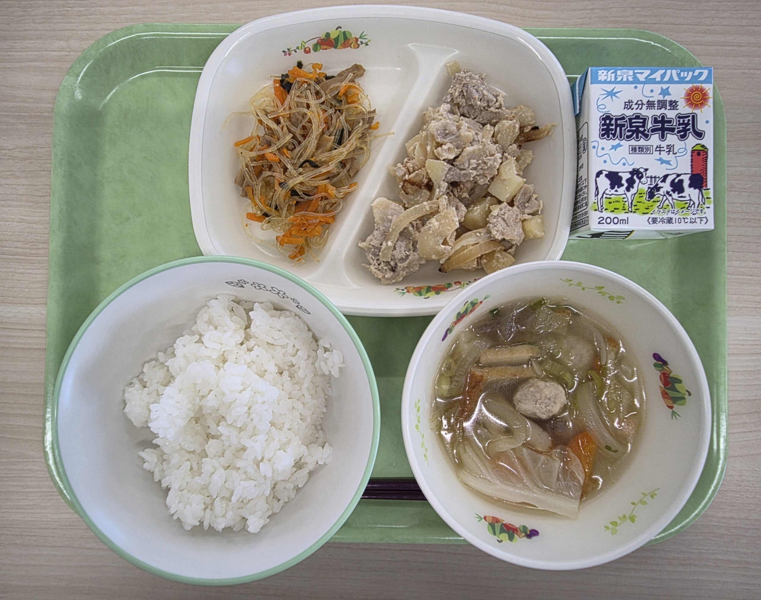 ごはん、牛乳、豚肉のみそマヨガーリック焼き、春雨の炒め煮、塩ちゃんこ汁