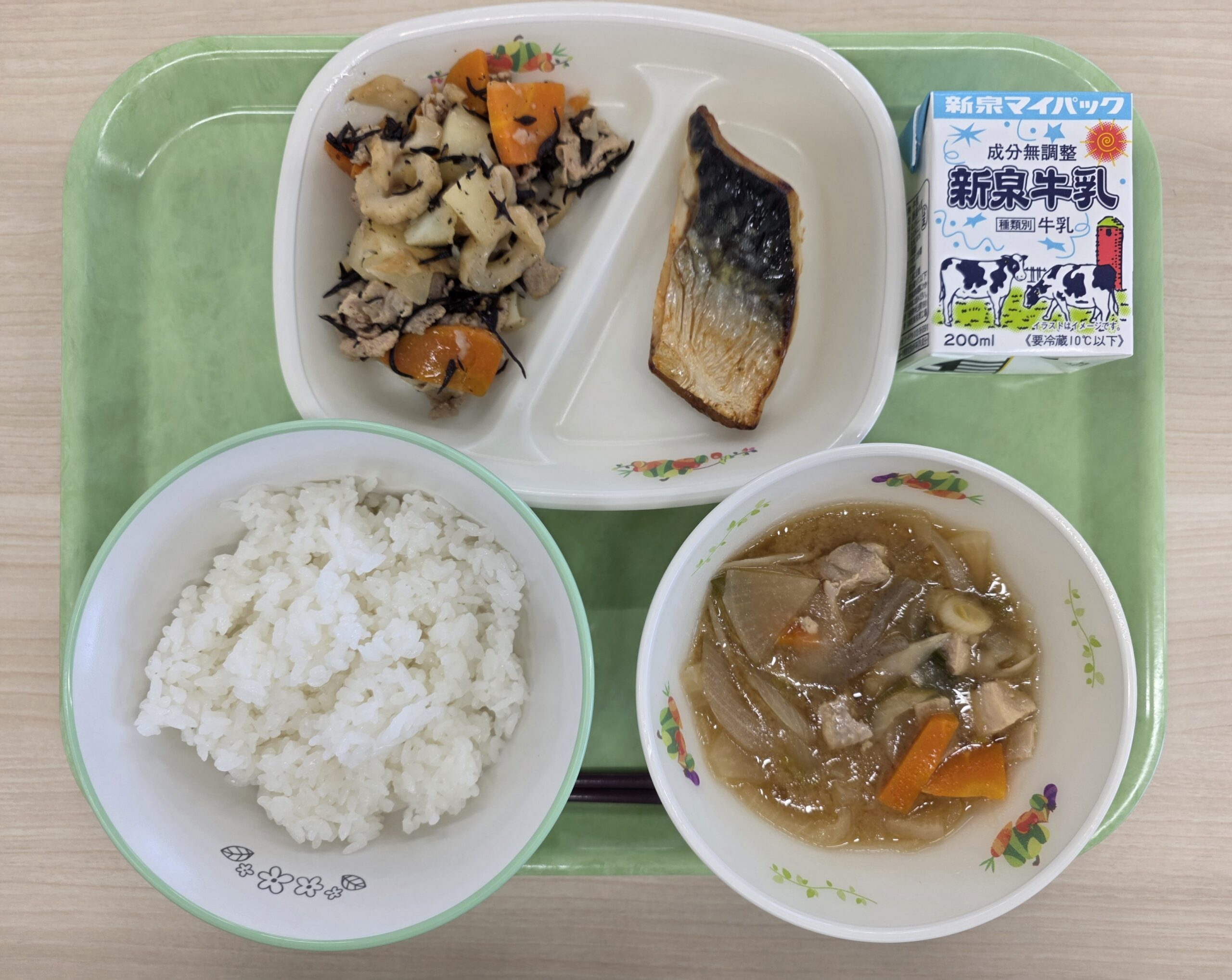 ごはん、牛乳、さばの塩焼き、じゃがいものいそ煮、五目汁