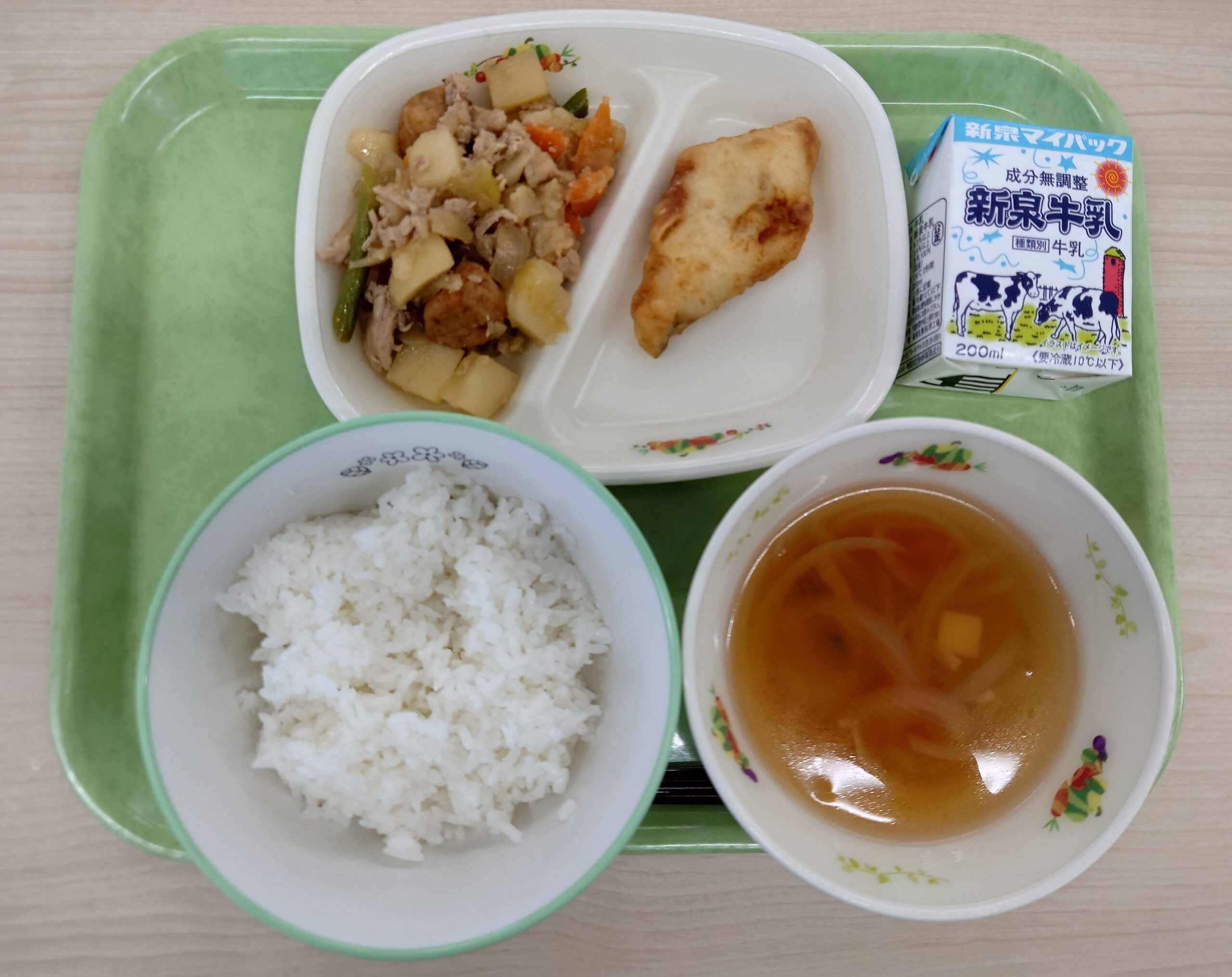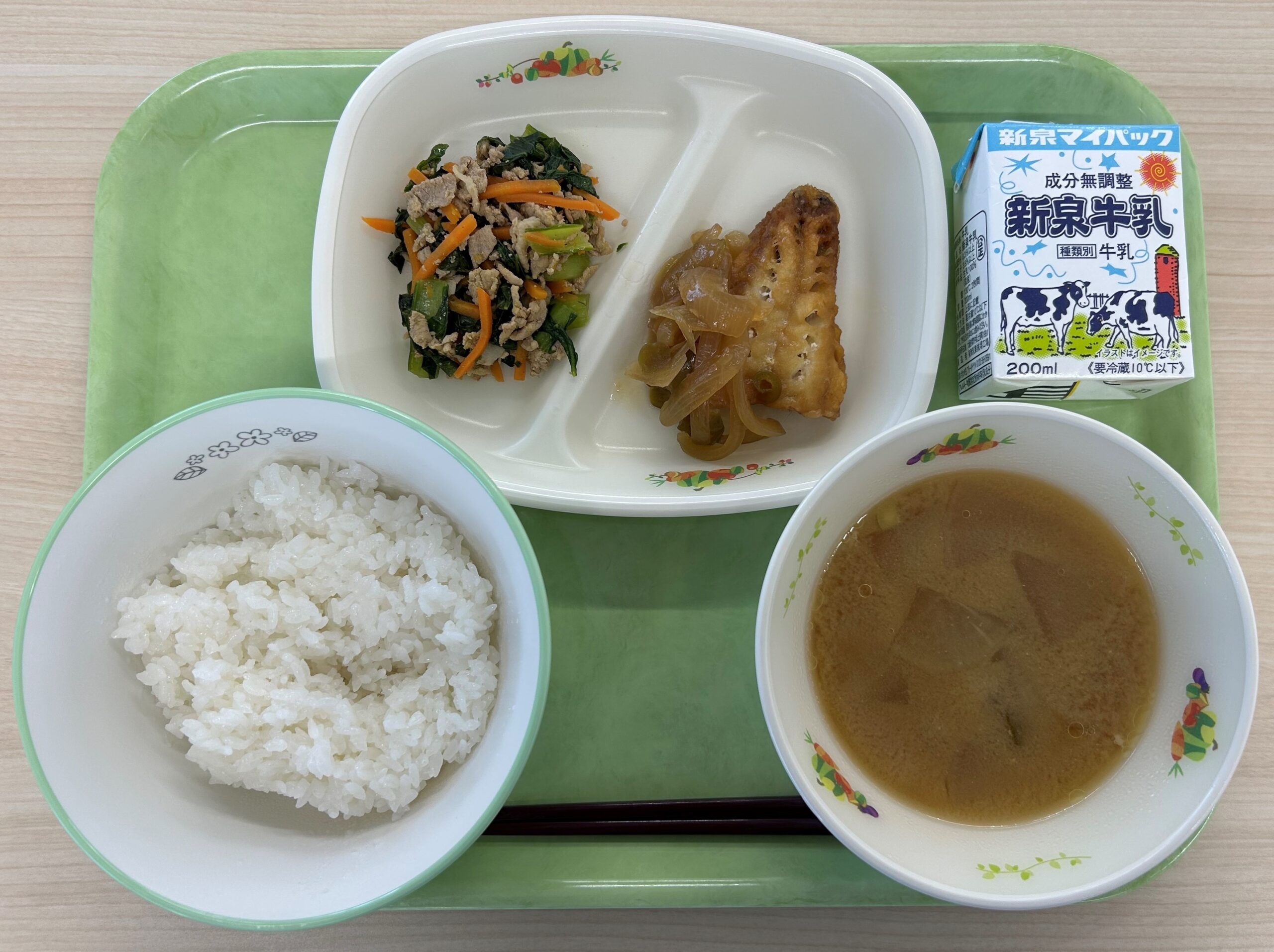 ごはん、牛乳、白身魚の天ぷら、豚肉と野菜のしょうが煮、すまし汁