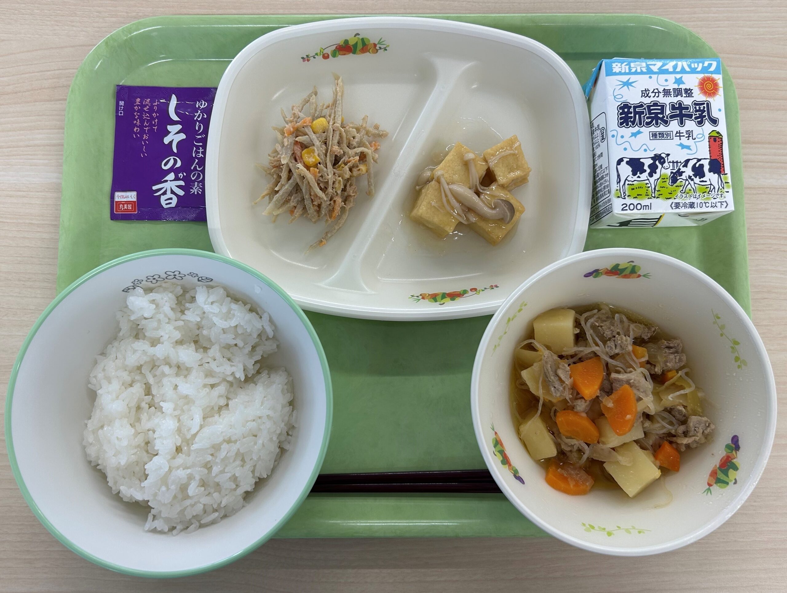 ごはん、牛乳、厚揚げのしょうがあんかけ、ごぼうサラダ、ふりかけ