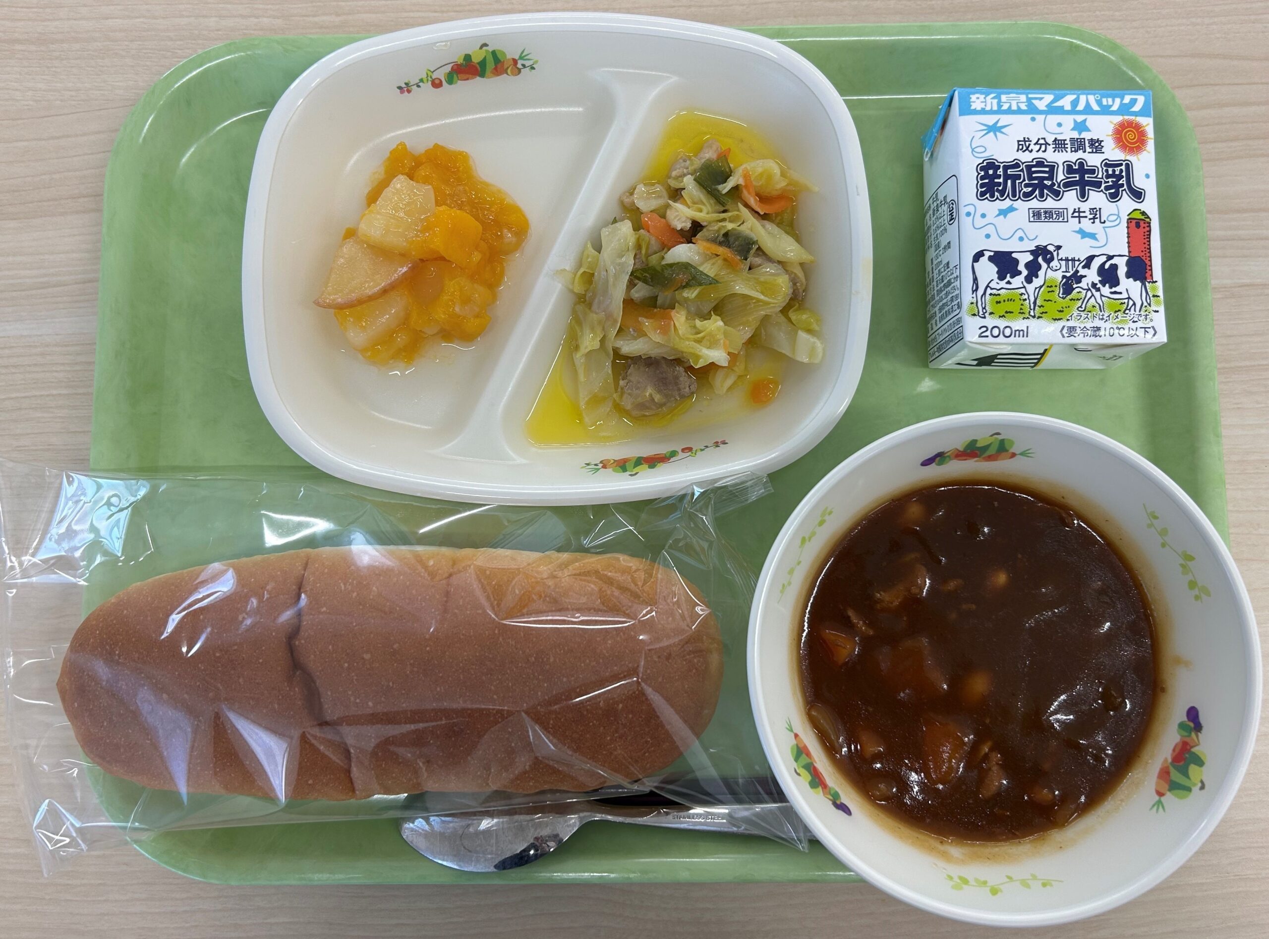 コッペパン、牛乳、ビーンズシチュー、鶏肉とキャベツのガーリック炒め、フルーツコンポート