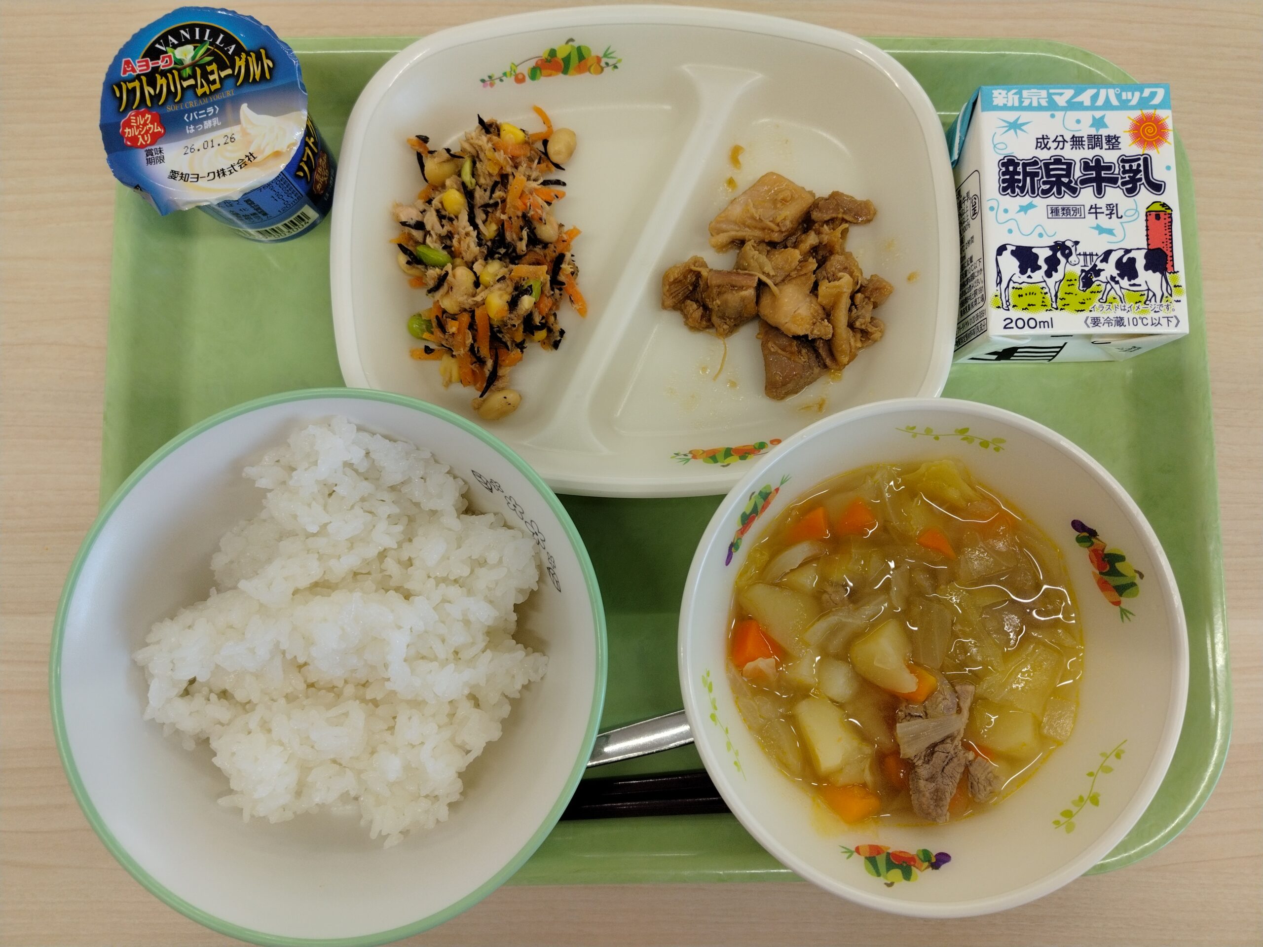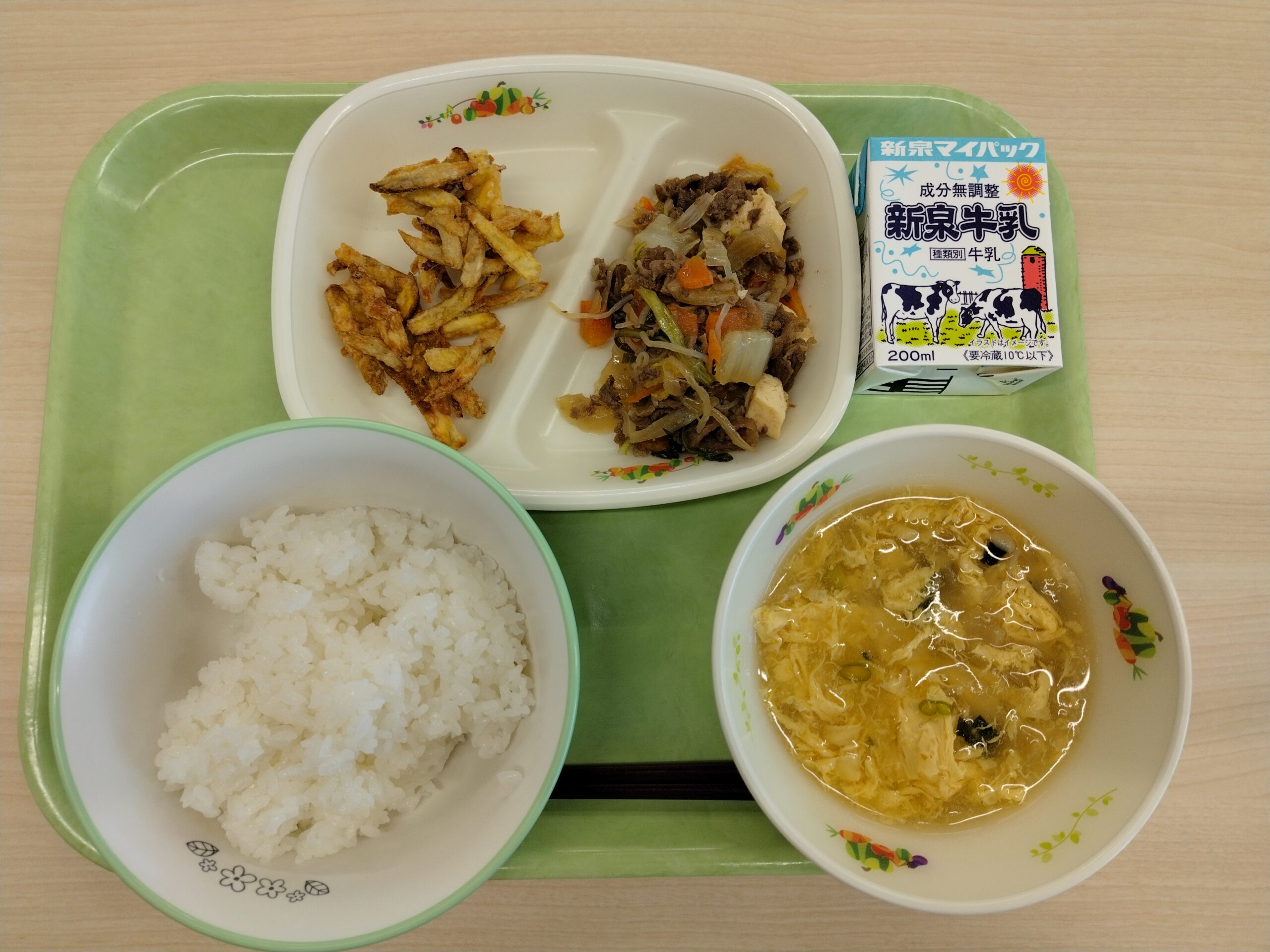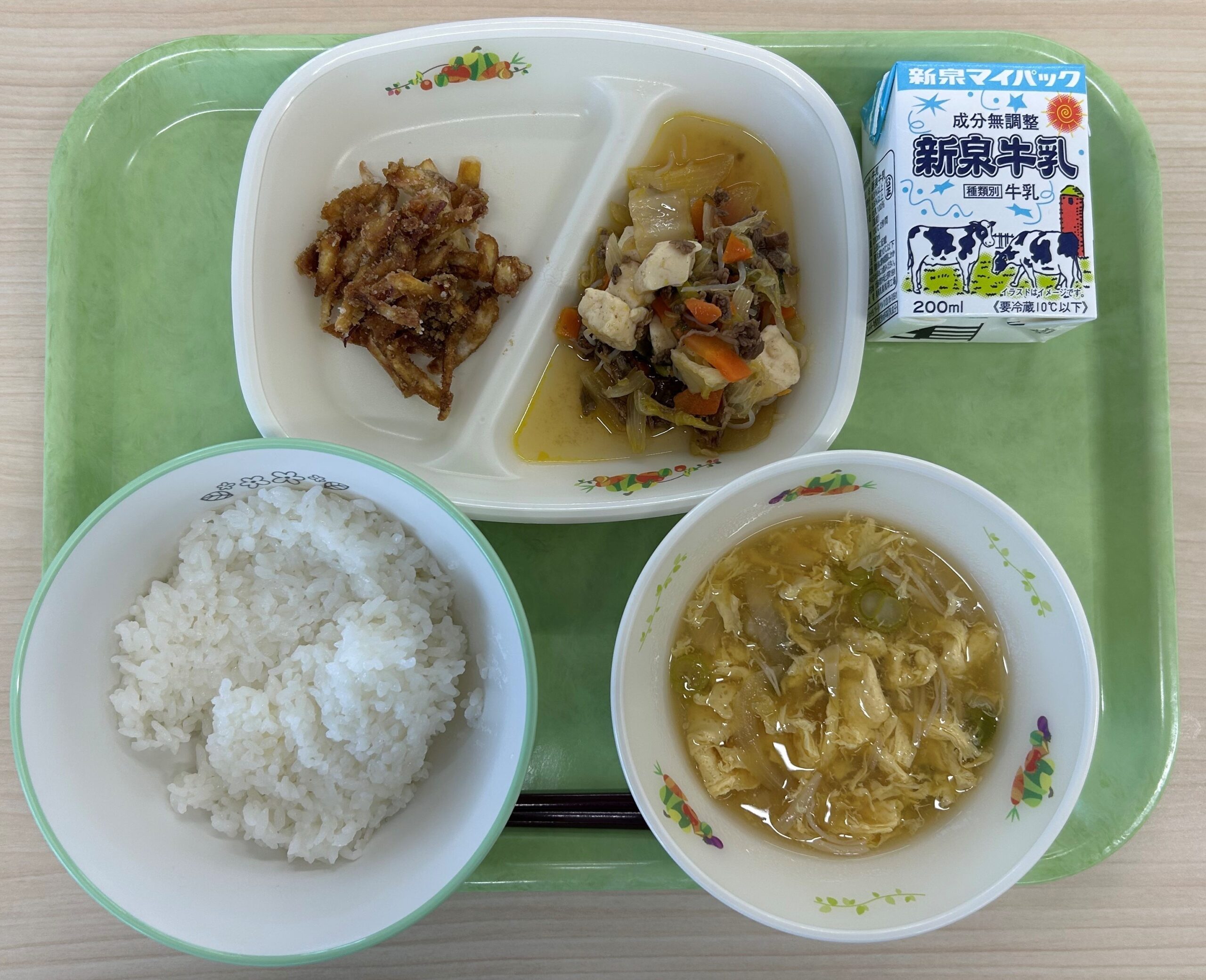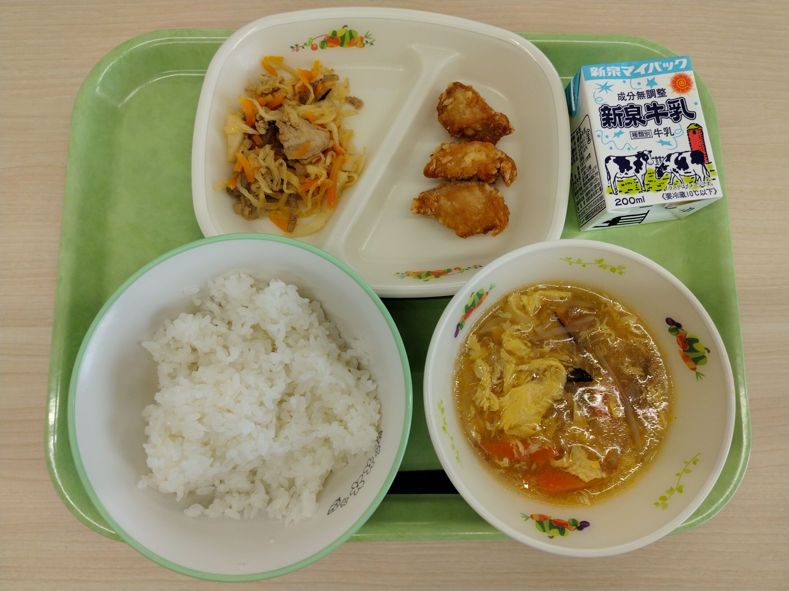 ご飯、牛乳、鶏肉のから揚げ、千切りイリチー、四川風スープ