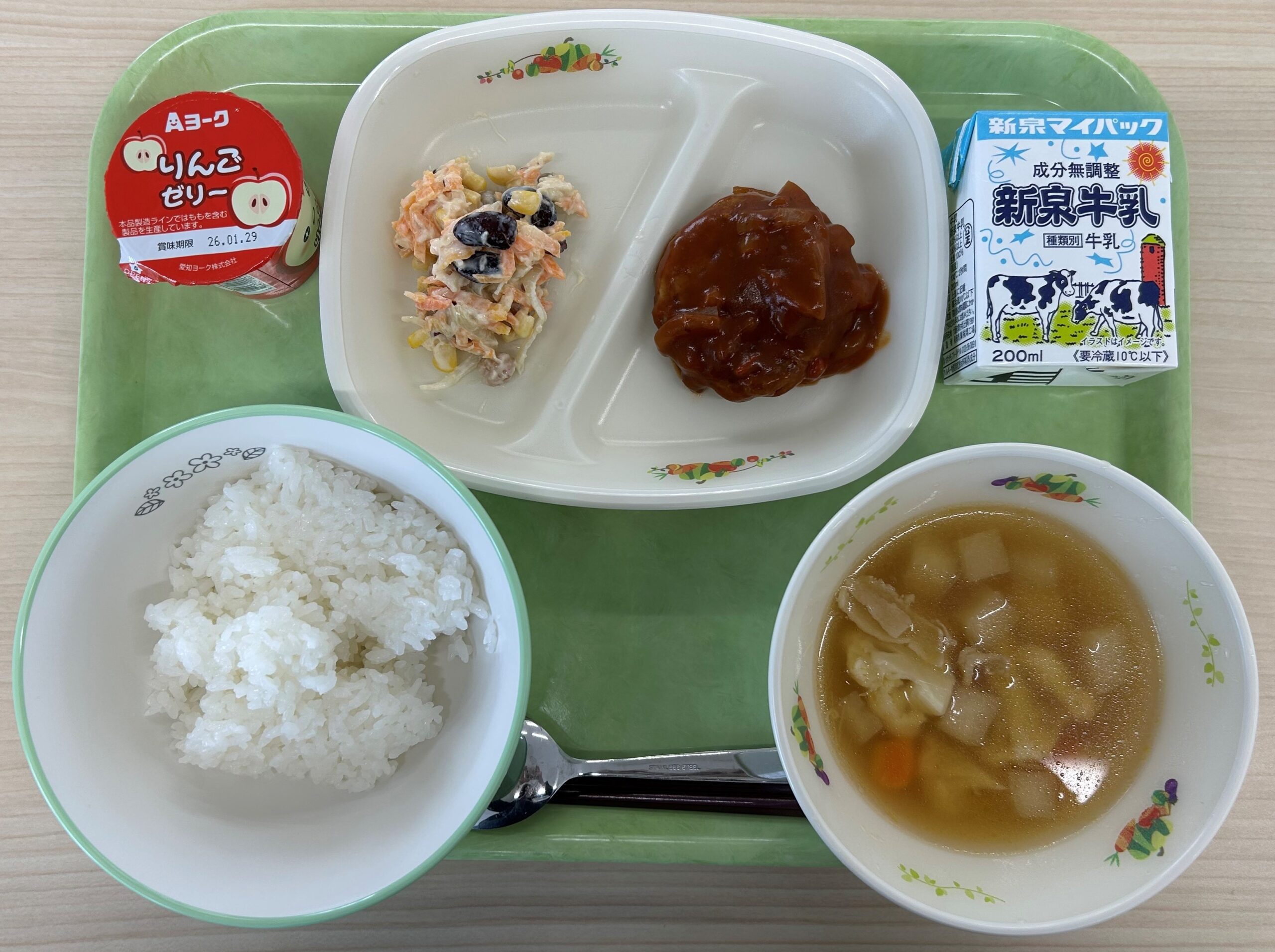 ご飯、牛乳、デミグラスソースハンバーグ、ビーンズサラダ、冬野菜スープ、フルーツゼリーりんご