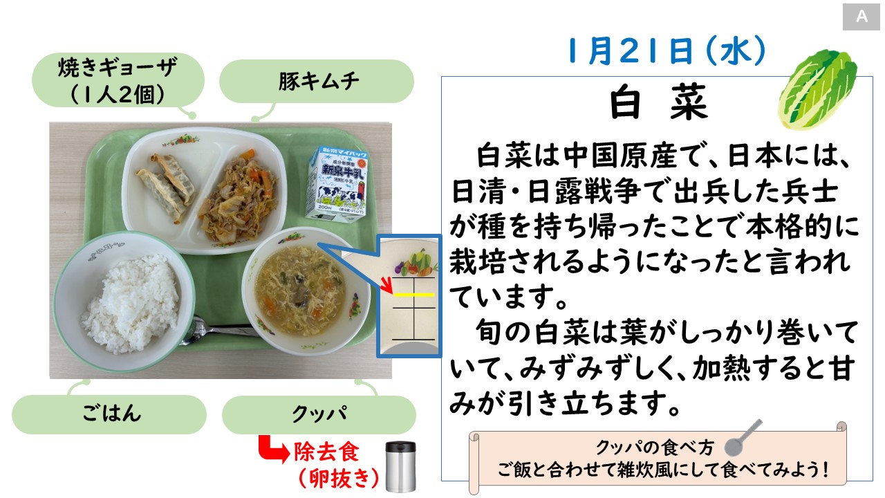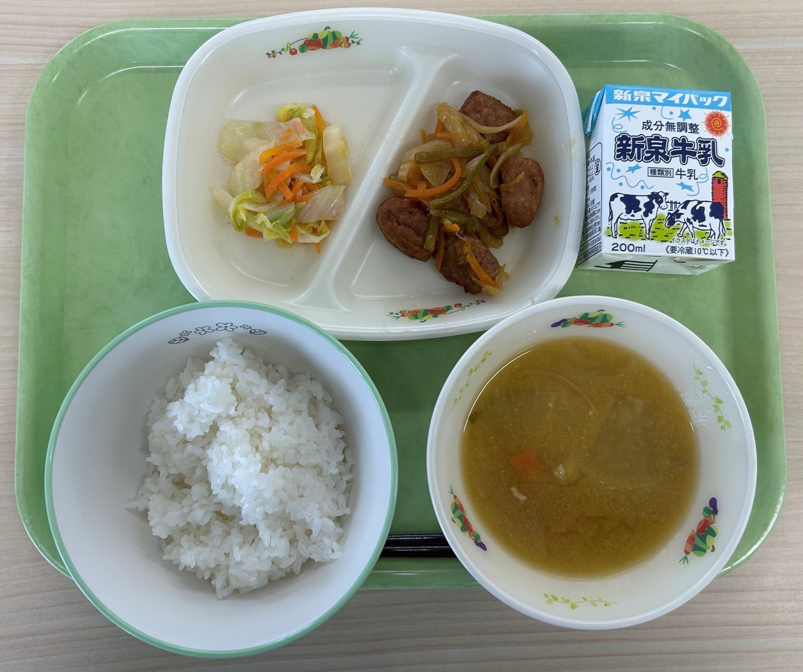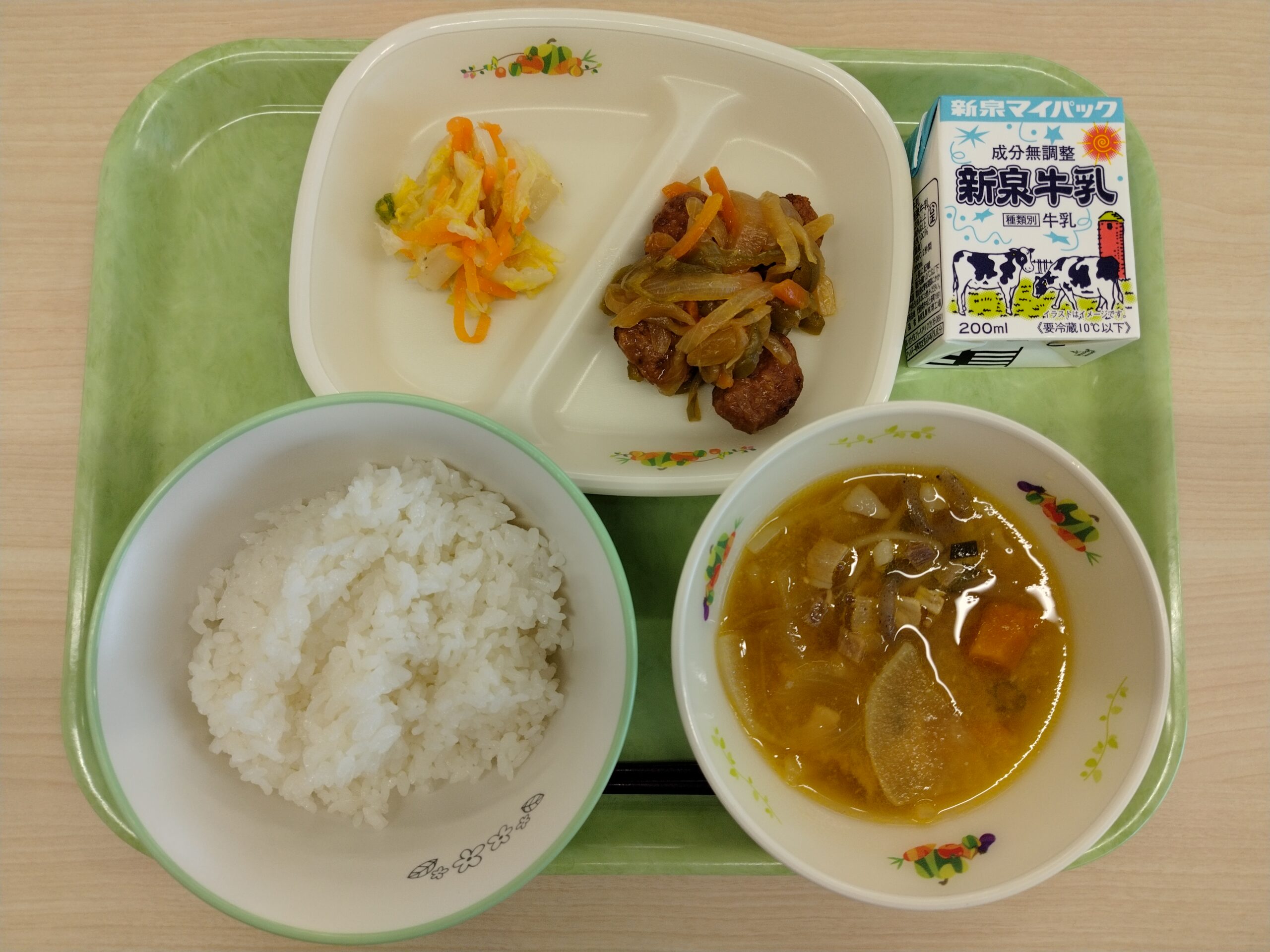 ご飯、牛乳、肉団子の甘酢あんかけ、白菜のゆずびたし、豚汁