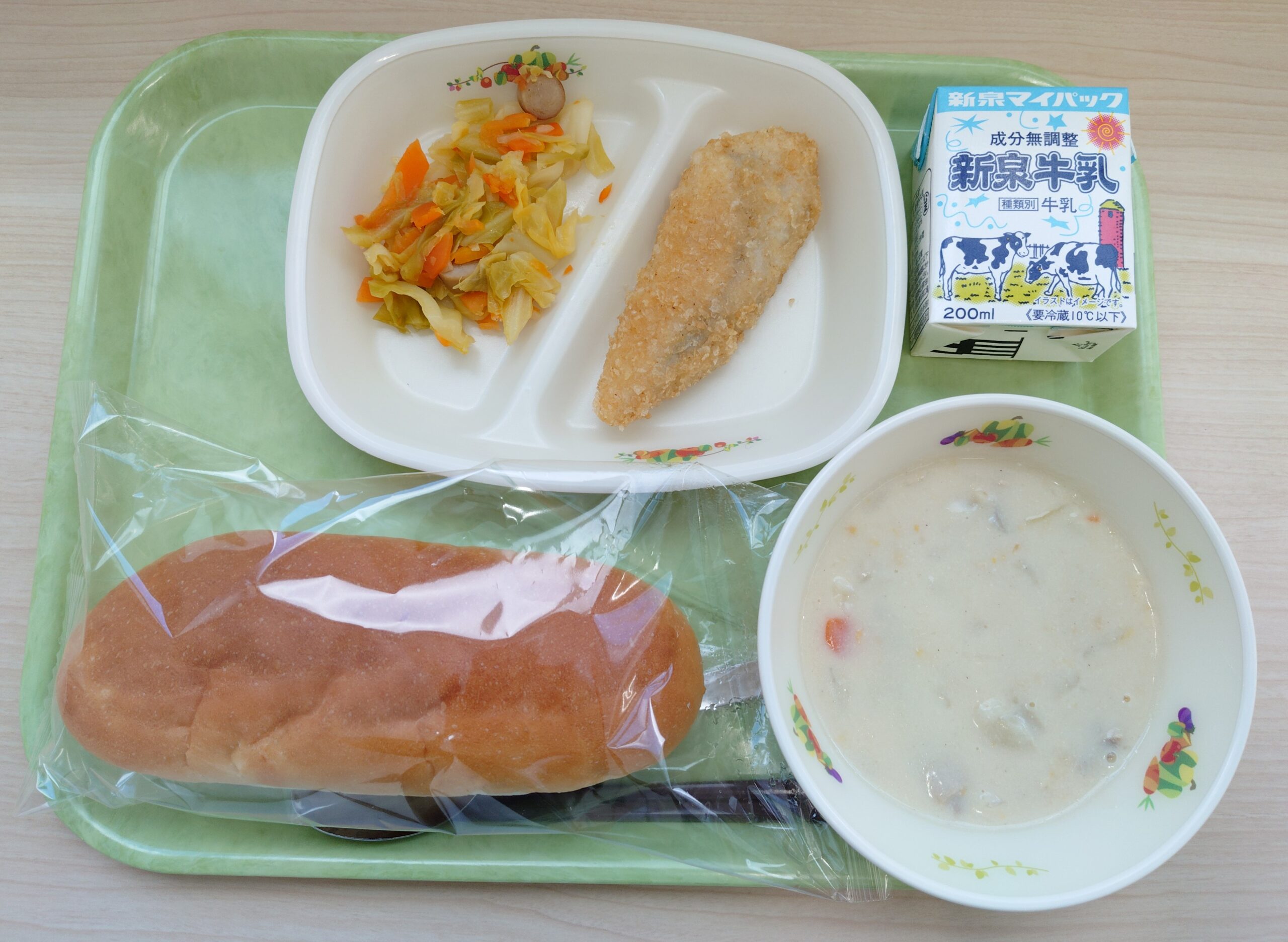 コッペパン、牛乳、かぶのシチュー、白身魚フライ、キャベツのソテー