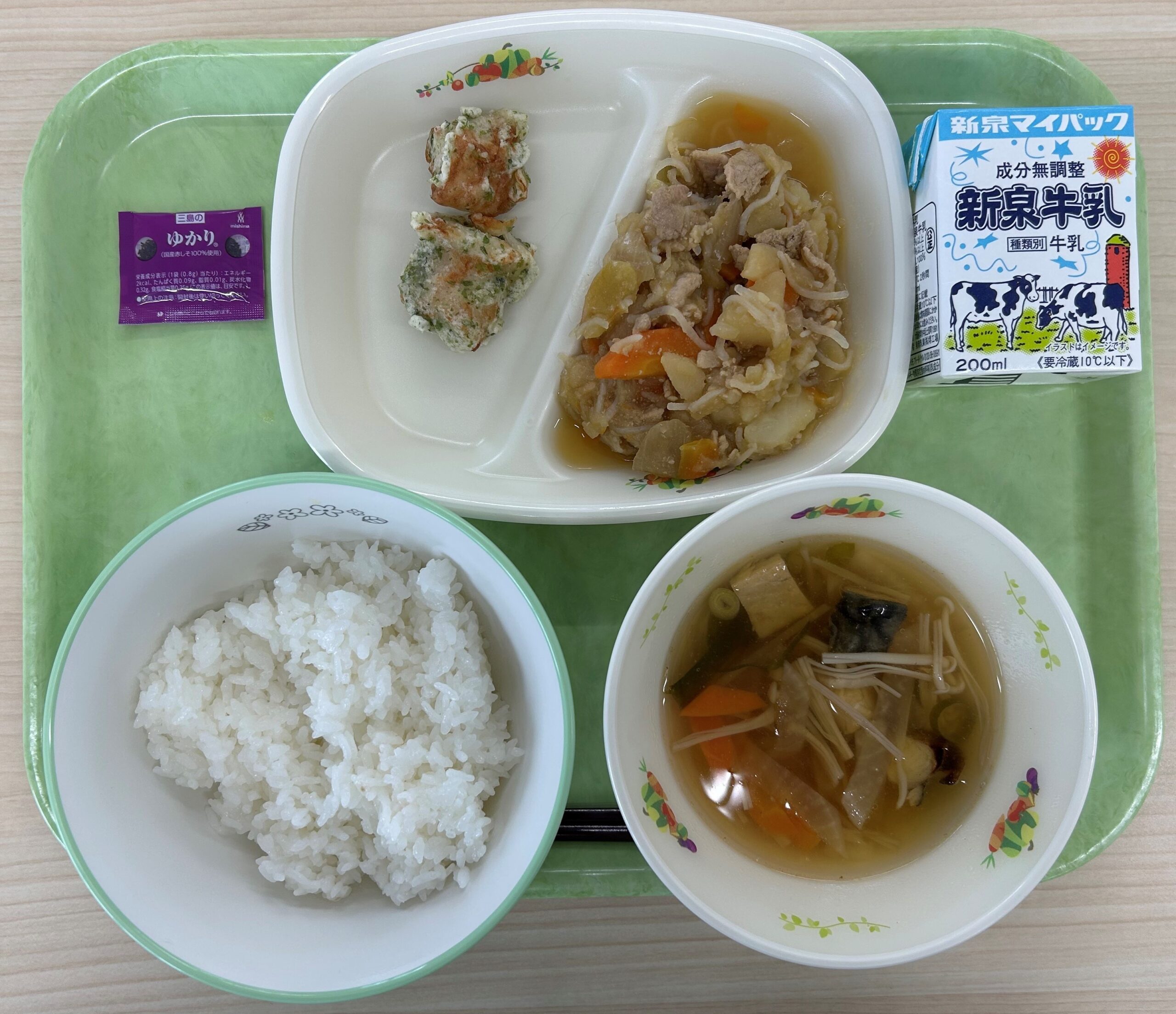 ご飯、牛乳、肉じゃが、ちくわの磯辺揚げ、船場汁、ふりかけ