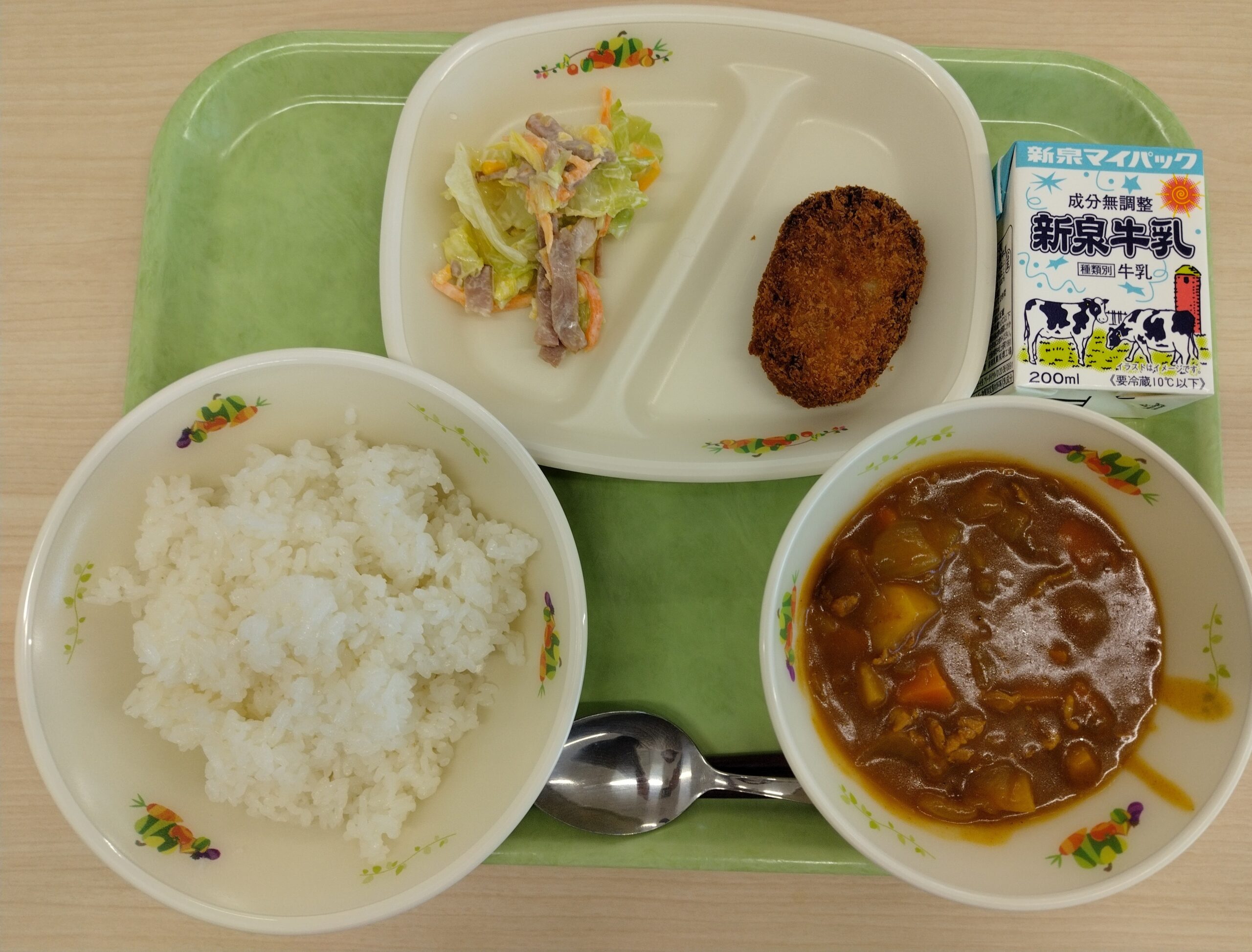 ご飯、牛乳、ポークカレーライス、ミンチカツ、コールスローサラダ