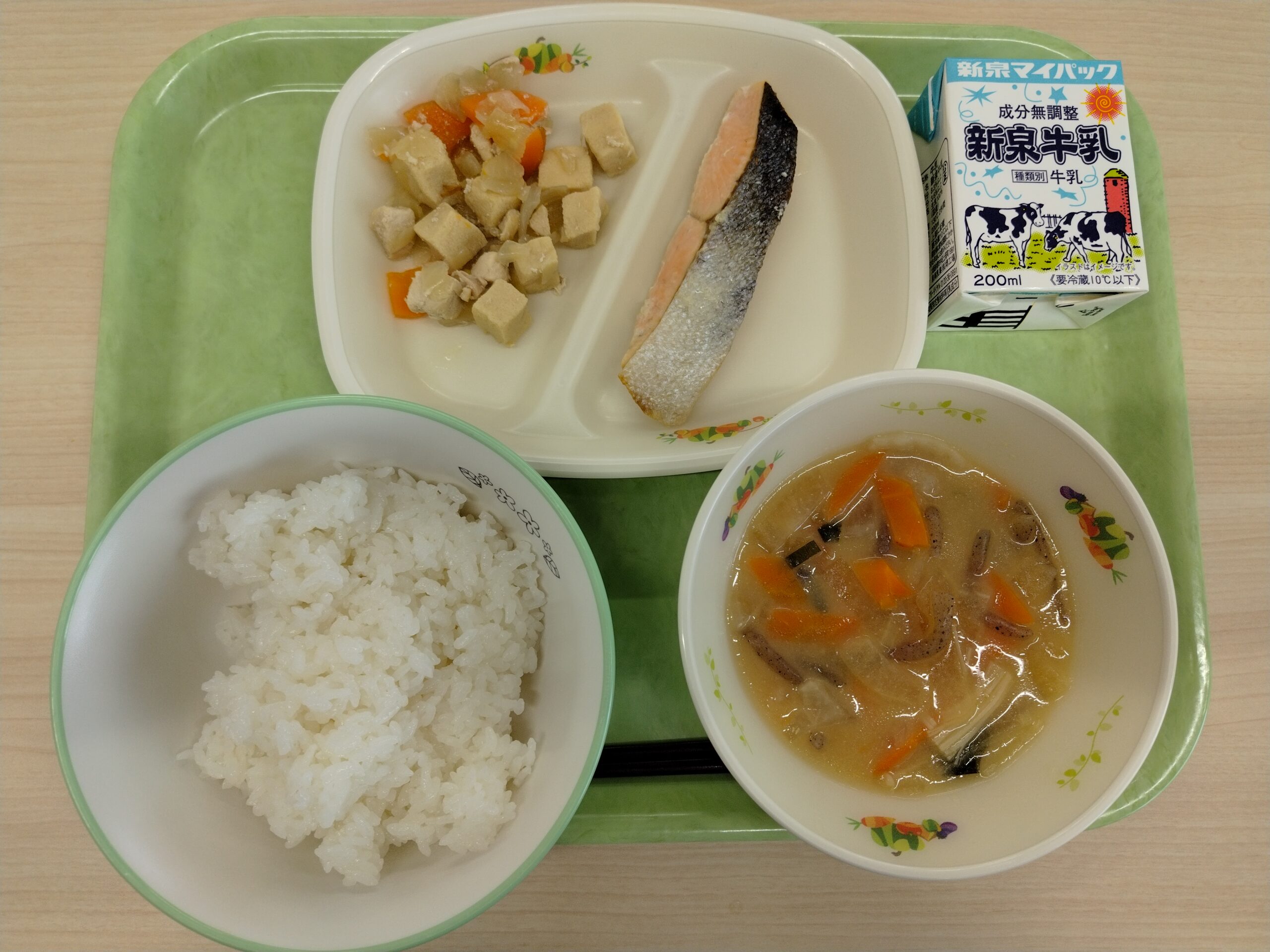 ご飯、牛乳、鮭の塩こうじ焼き、高野豆腐のふくめ煮、すいとん汁
